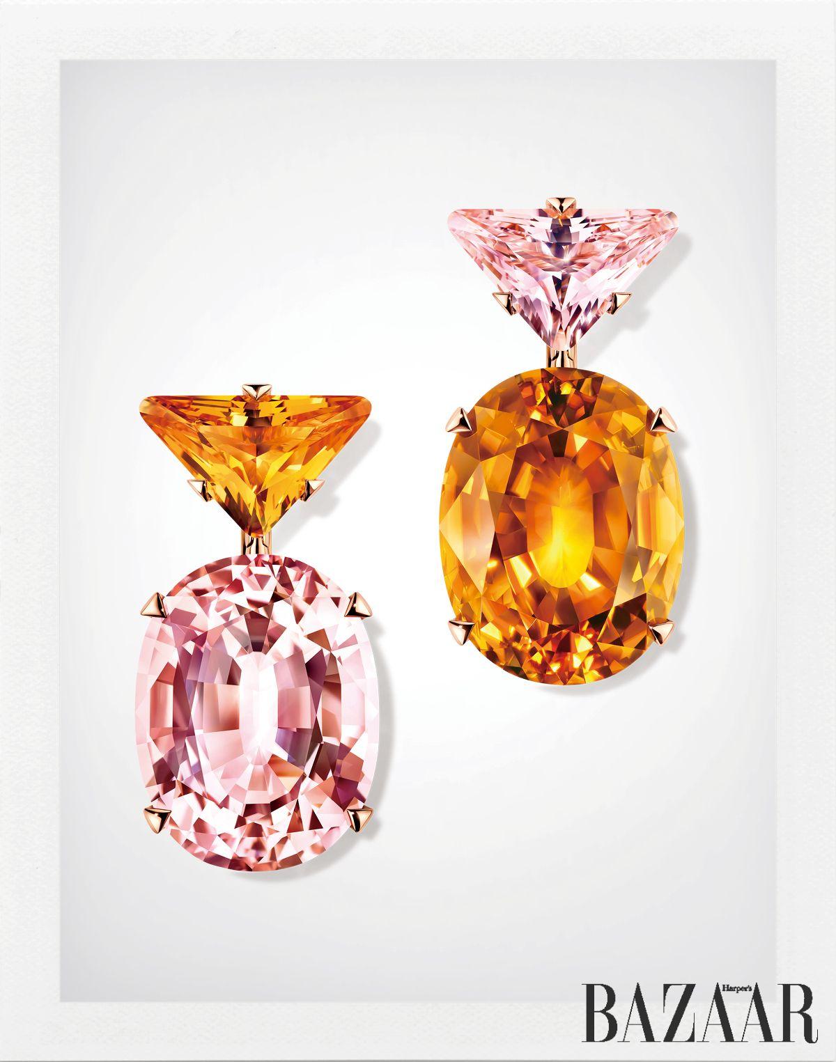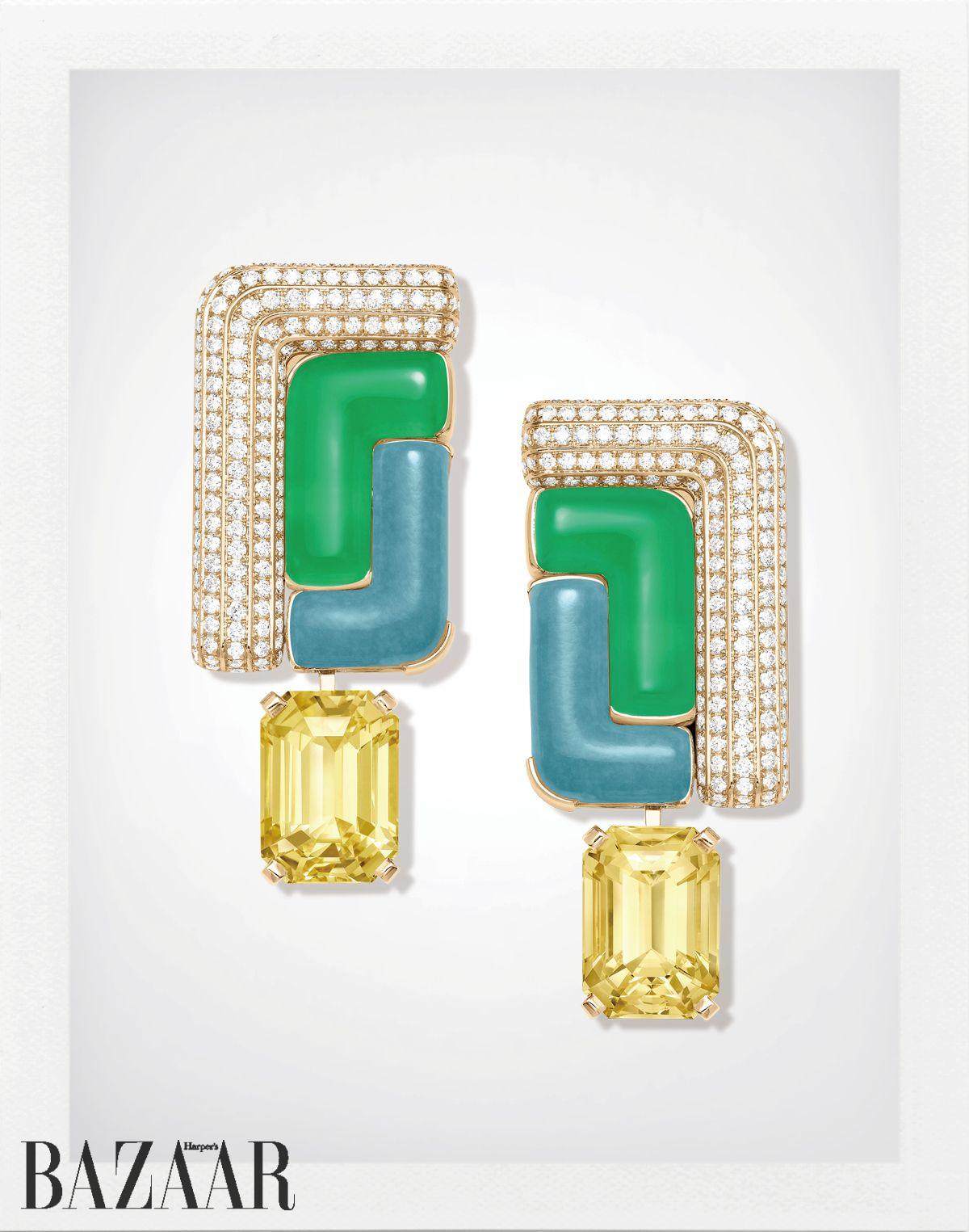 로즈 골드에 크리소레이즈, 트로일라이트, 옐로 사파이어를 기하학 모티프로 세팅한 ‘커브드 아티스트리’ 이어링은 Piaget.