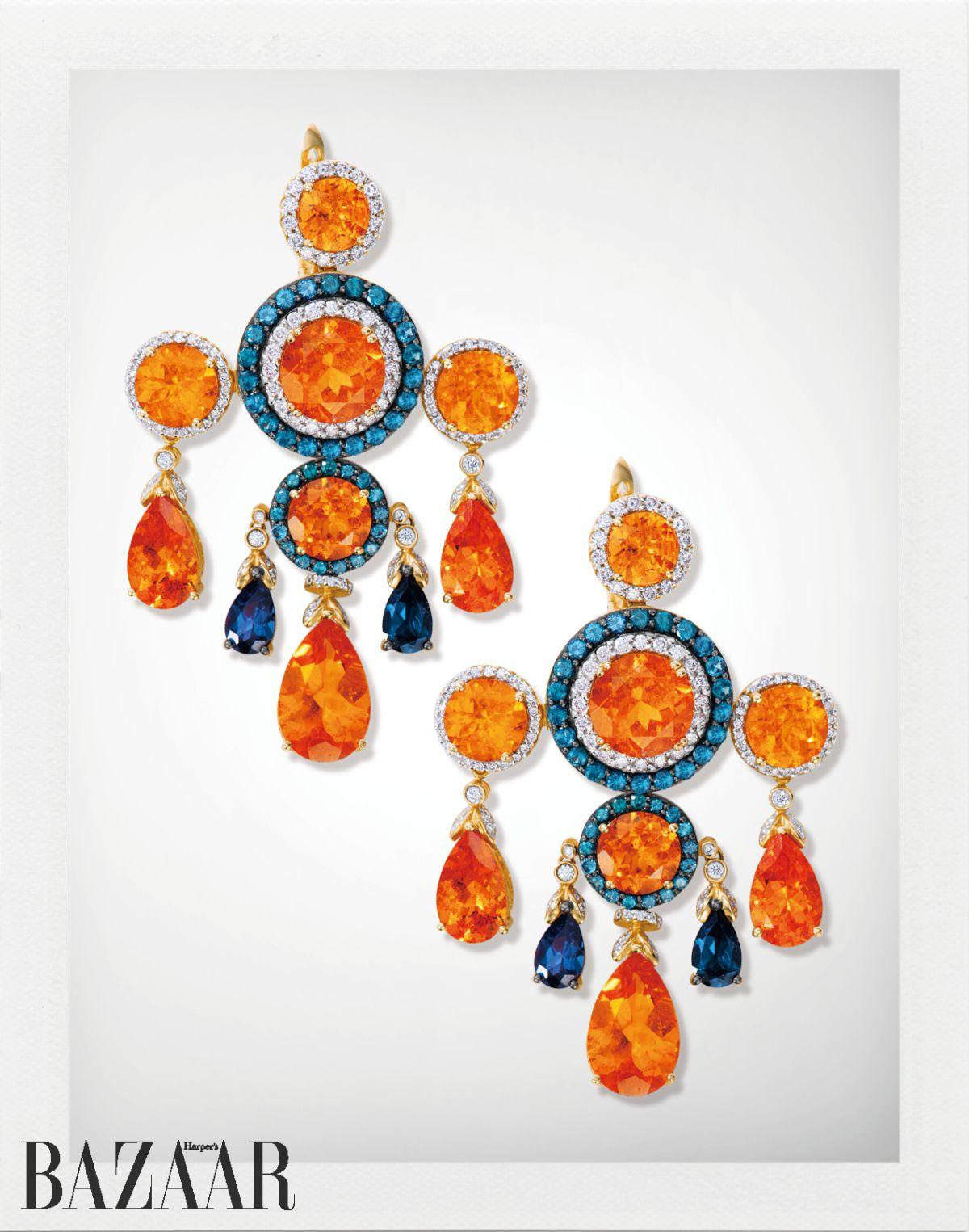 오렌지와 블루 스톤의 컬러 대비가 경쾌한 ‘레드 카펫’ 이어링은 Le Vian.