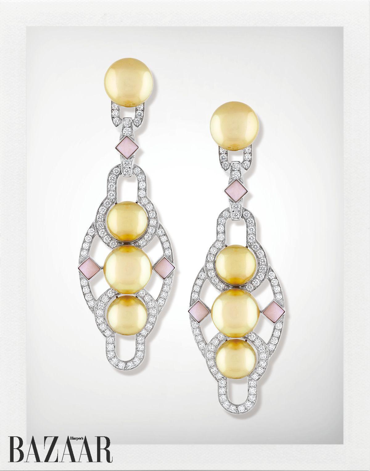 황금빛을 발하는 진주와 핑크 오팔을 메인 스톤으로 장식한 ‘보라 보라’ 이어링은 Van Cleef & Arpels.