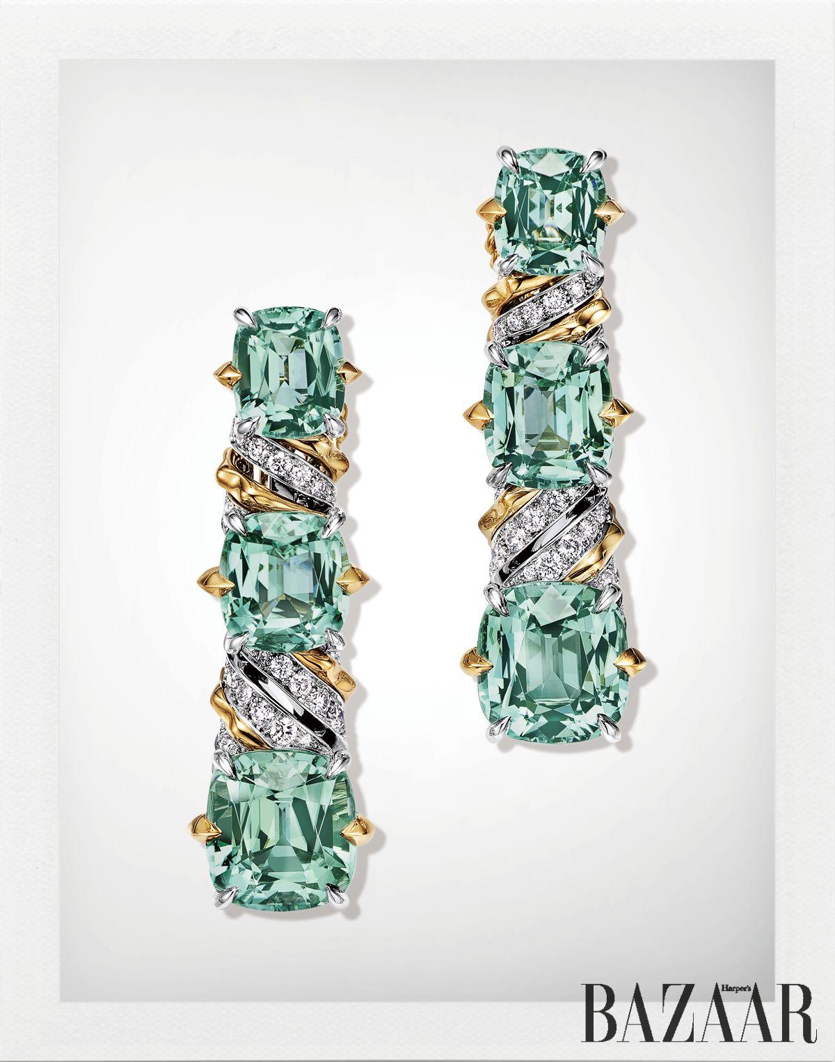 화이트 다이아몬드와 투르말린을 번갈아 배치한 ‘쉘 그린 투르말린’ 이어링은 Tiffany & Co..