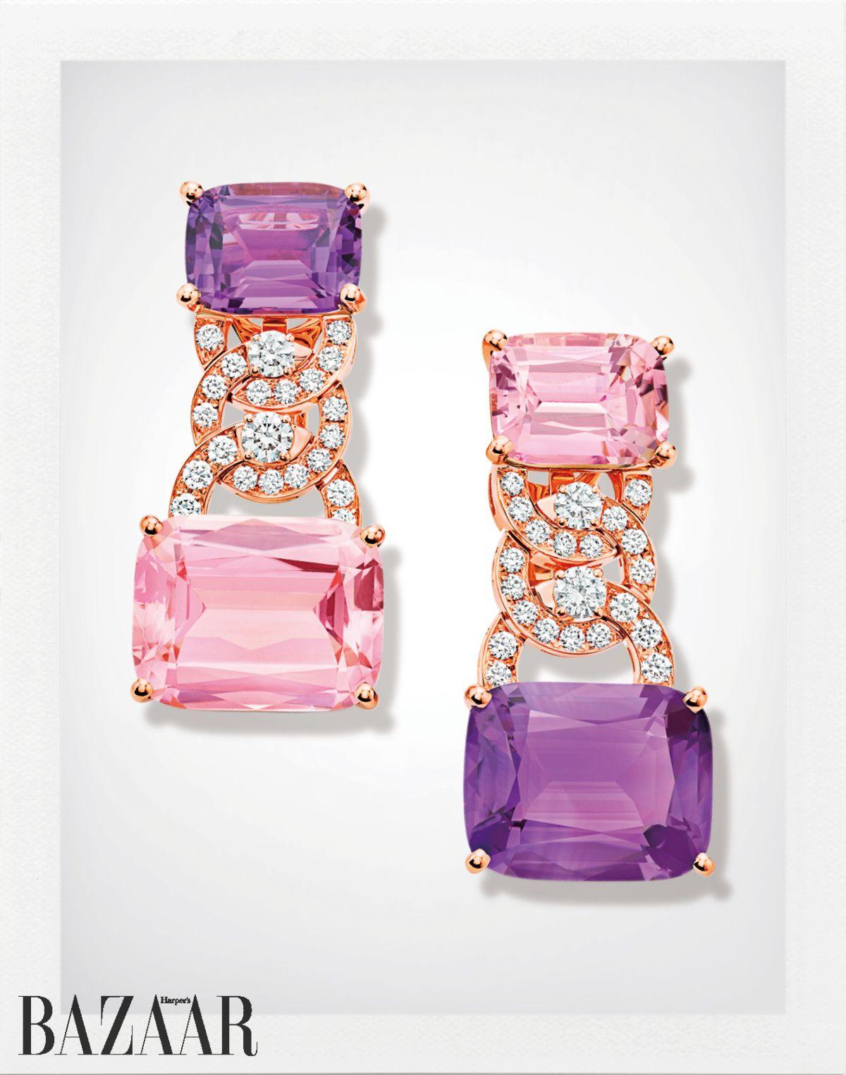 로즈 골드에 쿤차이트, 모거나이트를 언밸런스하게 세팅한 이어링은 Bvlgari.