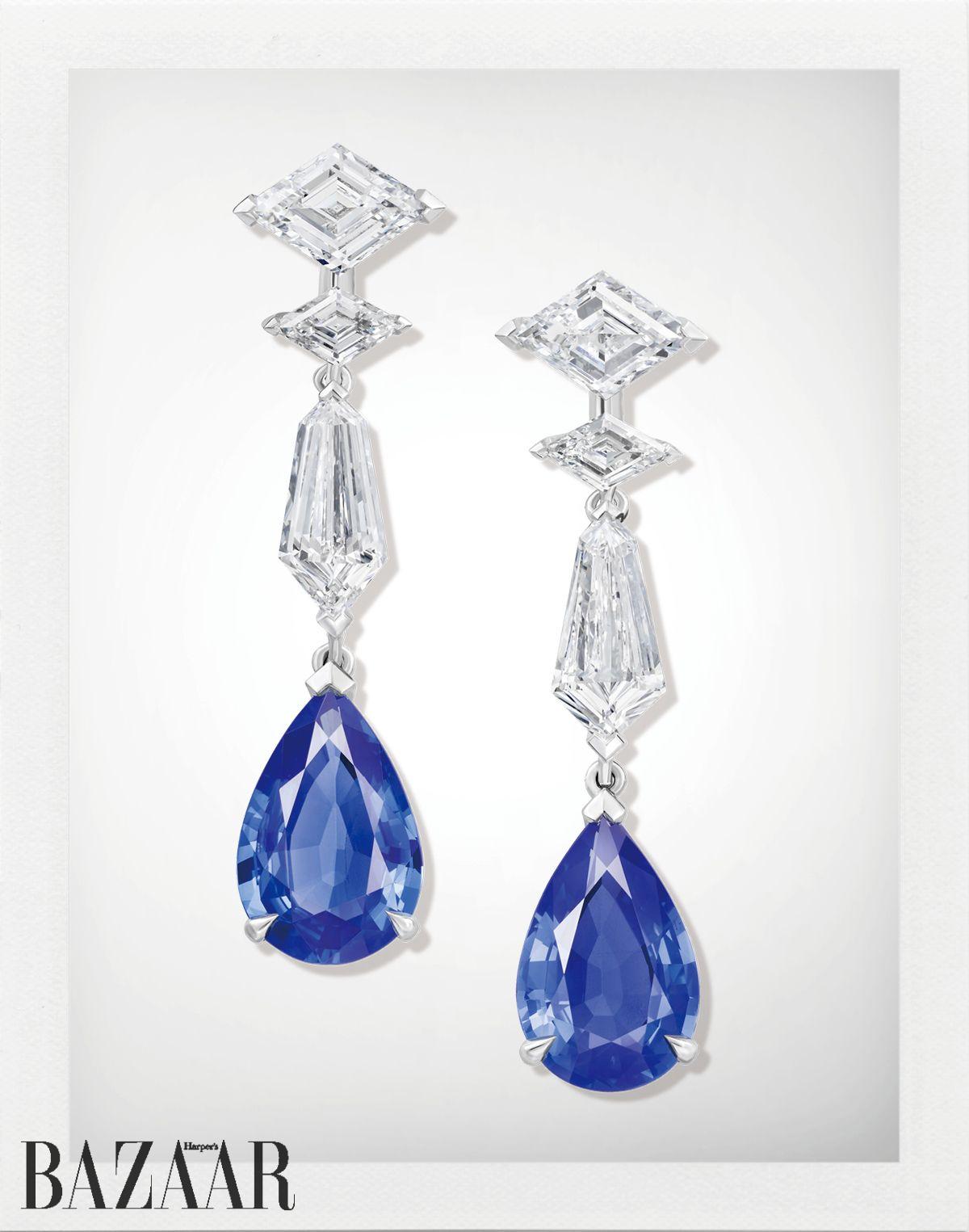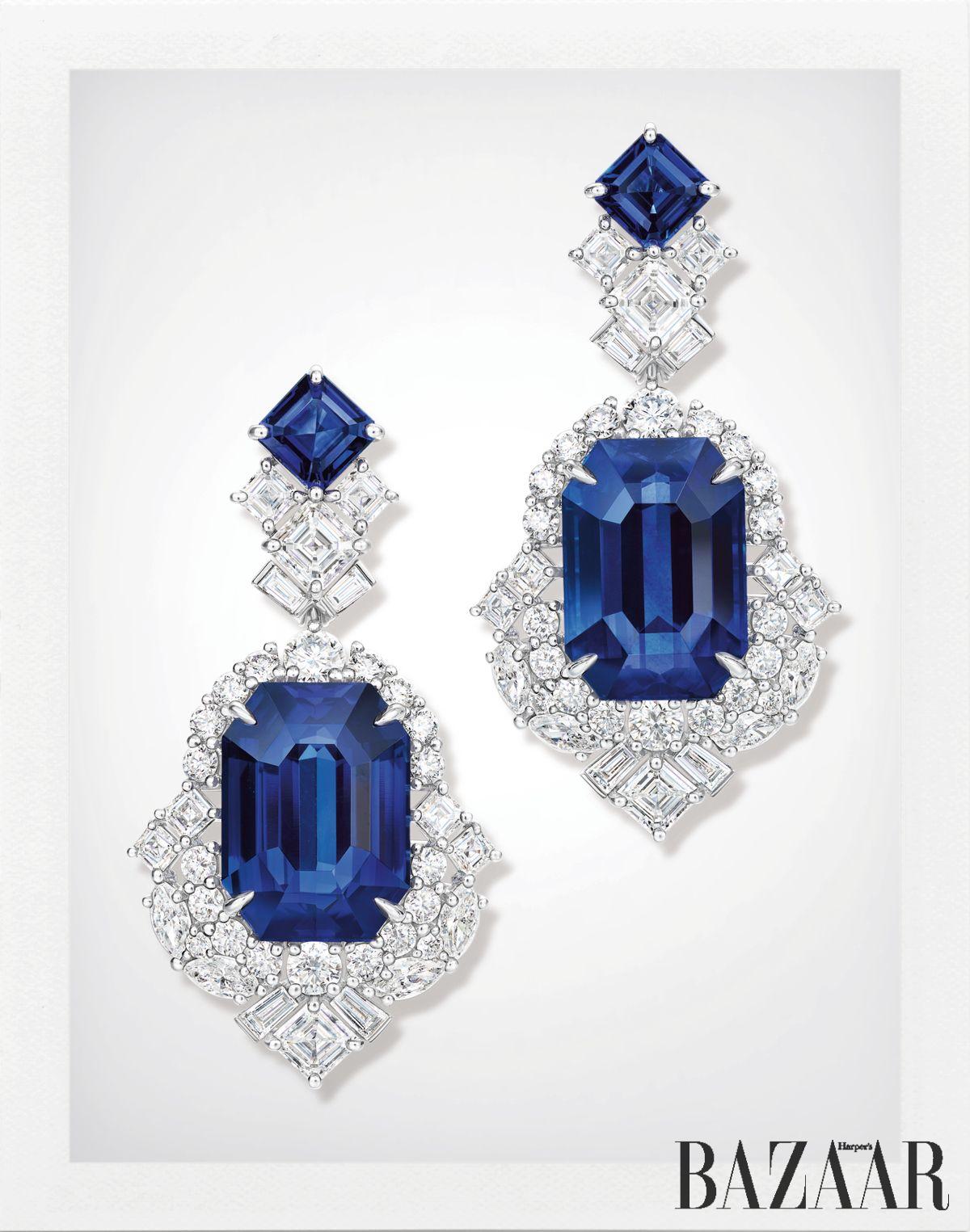 다이아몬드와 사파이어를 세팅한 플래티넘 소재 ‘톡 투 미(Talk to Me)’ 이어링은 Harry Winston.