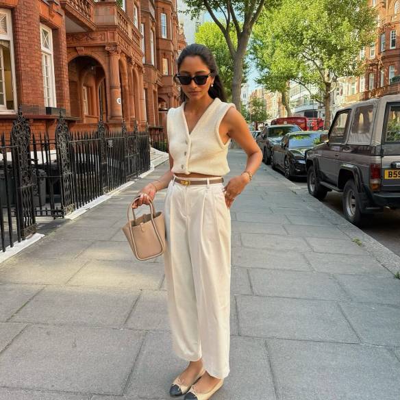 화이트 팬츠를 고루 활용하고 싶다면 화이트 셋업을 시도해보는 건 어떨까? 상의 밸런스만 맞출 수 있다면 더 정제된 인상의 세련된 분위기를 연출할 수 있다. 인플루언서 라우라는 테일러드 재킷과 부드럽게 흐르는 팬츠를 매치해 구조와 유연함을 표현했다. 같은 톤 안에서도 다른 질감이 어우러지며 입체감을 형성하고, 슬림한 포인티드 슈즈가 하단을 길고 날렵하게 정리한 것. 여기에 블랙 톤의 컴팩트한 백으로 대비를 더해 전체 스타일을 단단하게 마무리한 것이 핵심이다. 컬러를 비운 만큼, 실루엣과 소재의 완급에 세심하게 주의를 기울인다면 화이트 셋업의 완성도를 높이는 것은 어렵지 않다.