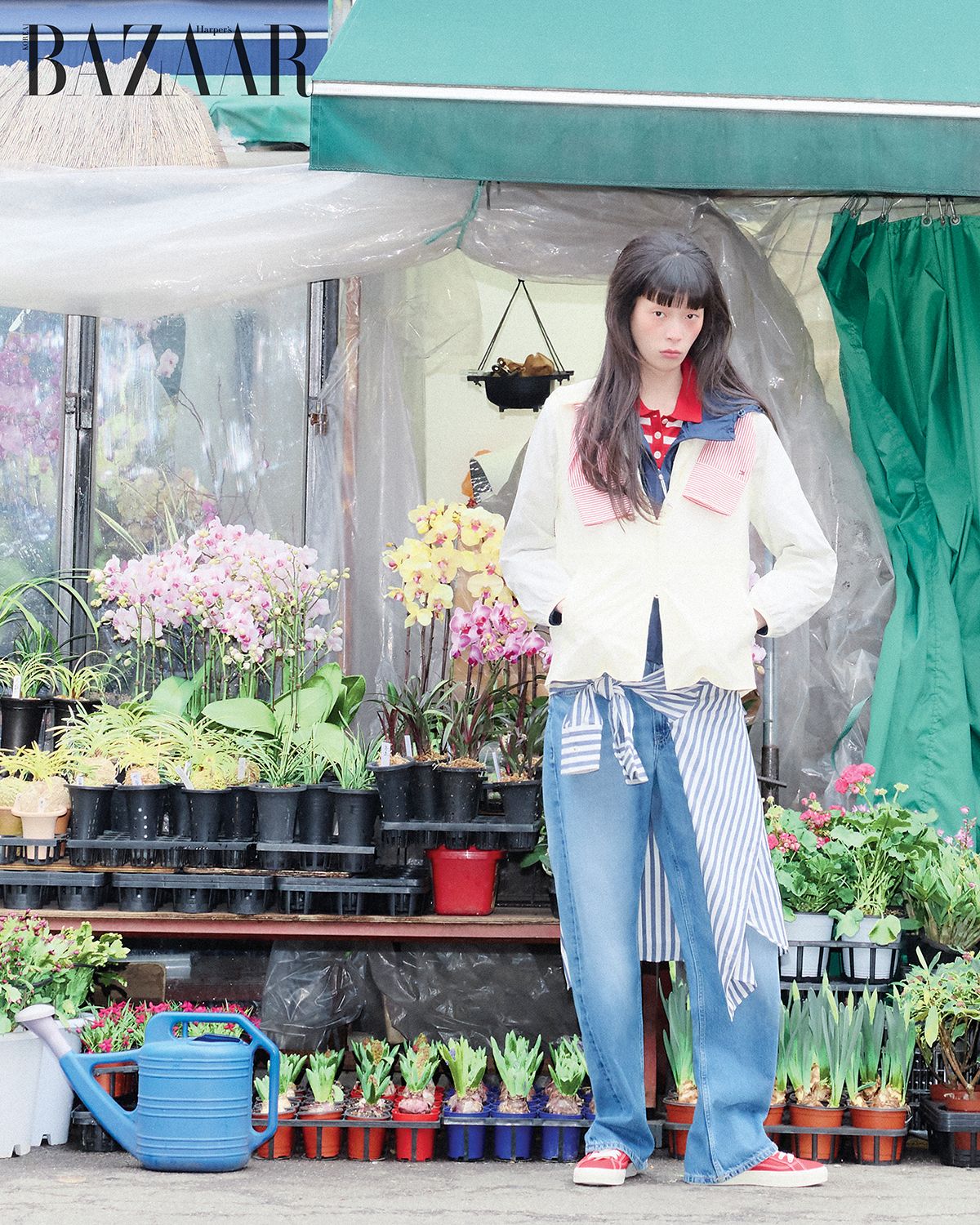 재킷은 31만원대, 옐로 컬러 톱은 21만원대, 이너 스트라이프 티셔츠는 8만원대, 팬츠는 23만원대, 스니커즈는 14만원대 모두 Tommy Hilfiger.