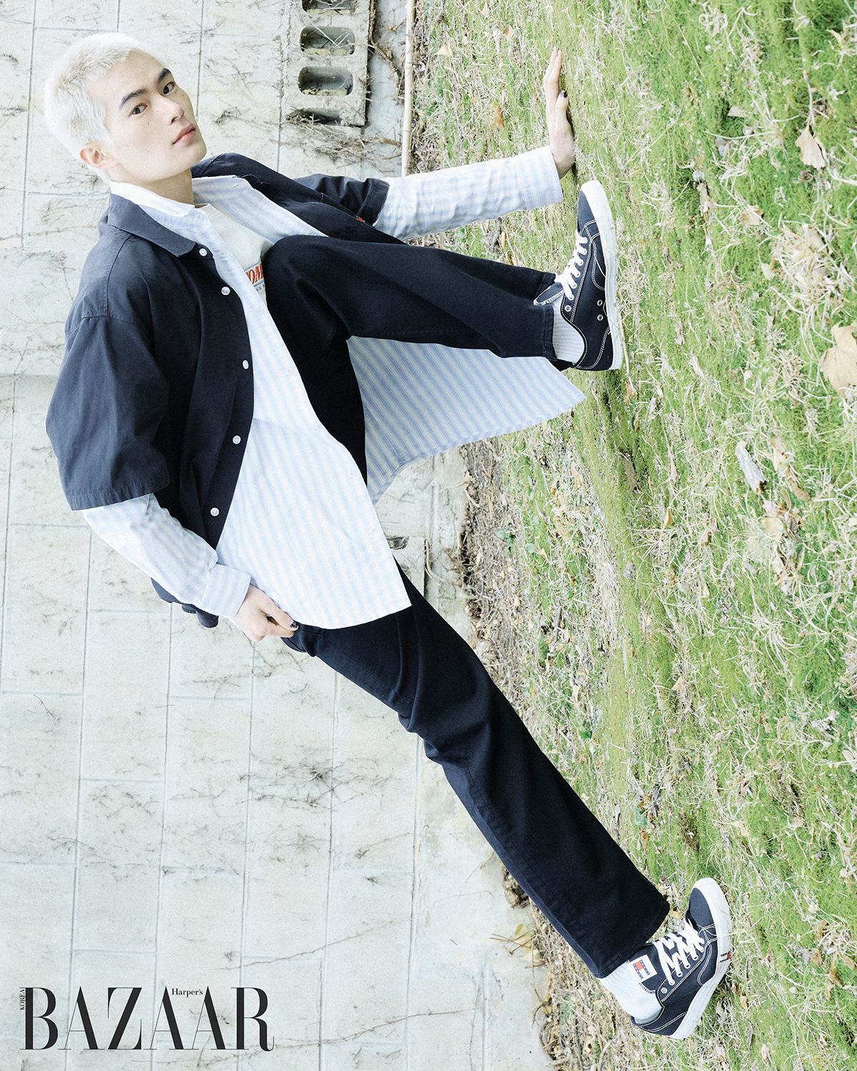 블랙 셔츠는 15만원대, 레이어드한 스트라이프 셔츠는 13만원대, 티셔츠는 7만원대, 팬츠는 18만원대, 스니커즈는 11만원대 모두 Tommy Jeans. 양말은 에디터 소장품.