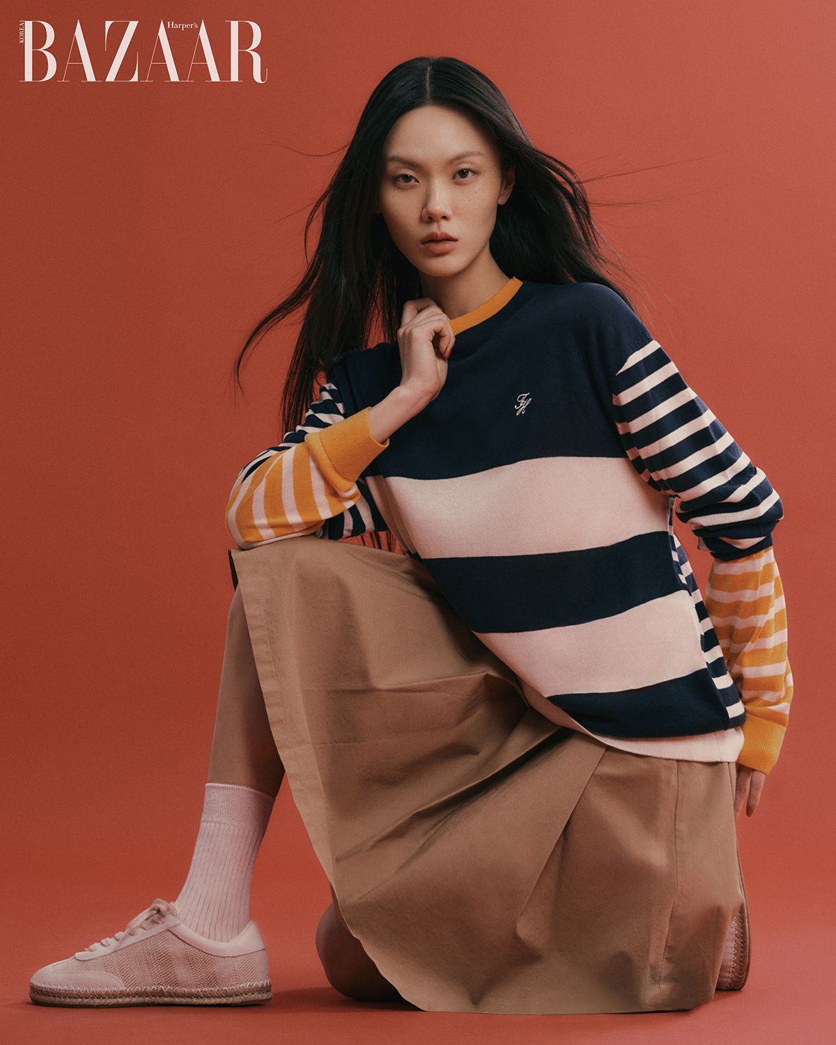 네이비 스트라이프 스웨터, 레이어드한 옐로 스웨터는 각각 27만원대, 플레어스커트는 27만원대, 스니커즈는 16만원대 모두 Tommy Hilfiger. 양말은 에디터 소장품.