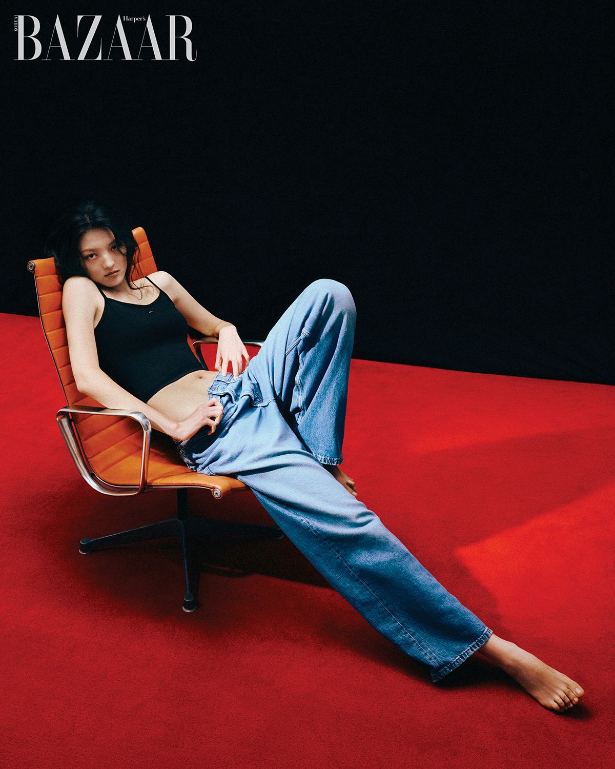 블랙·화이트 세트 슬리브리스 톱은 6만원대, 팬츠는 19만원대, 손에 들고 있는 재킷은 23만원대 모두 Tommy Jeans. 스니커즈는 14만원대 Tommy Hilfiger.