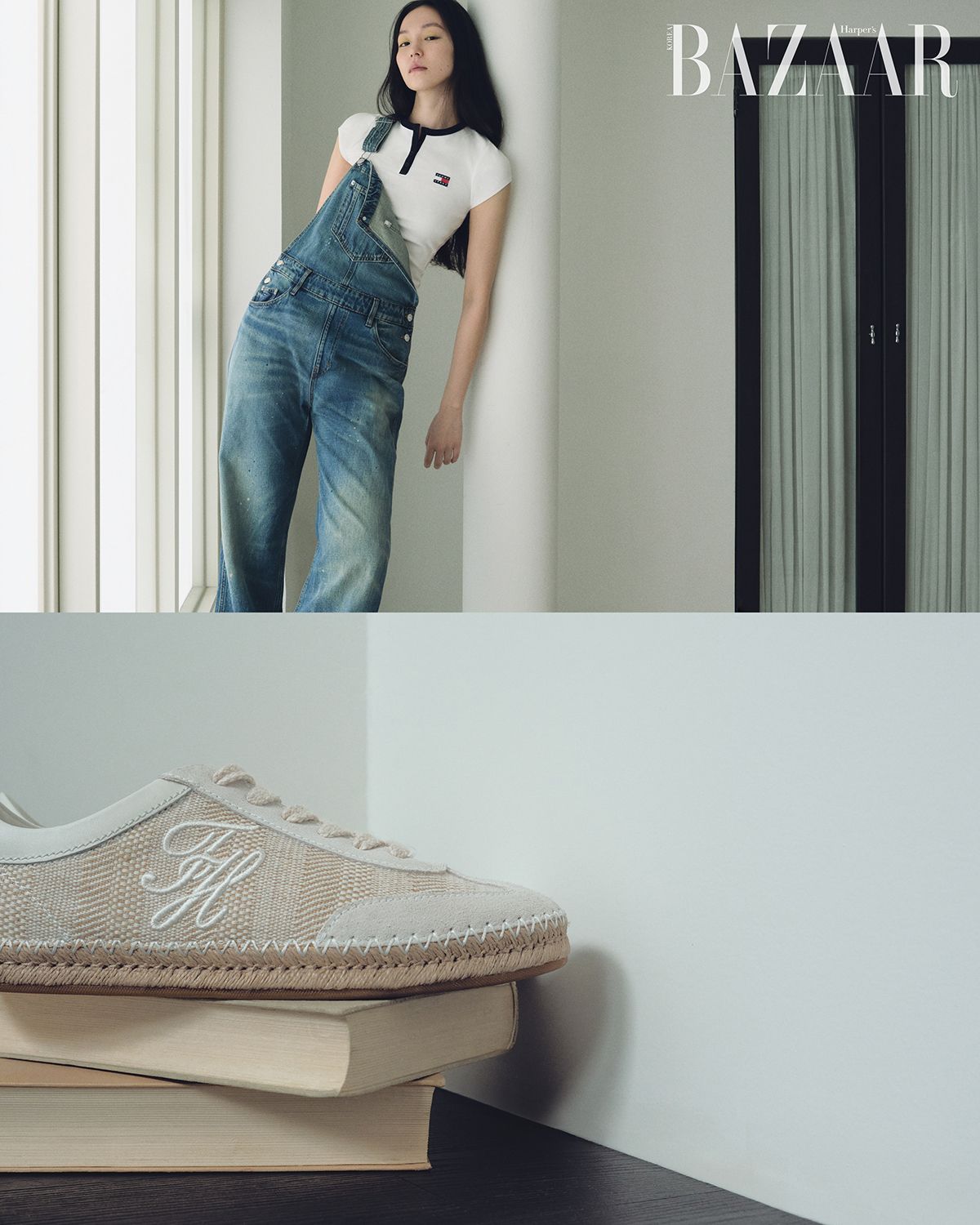 (위) 헨리넥 티셔츠는 5만원대, 오버올은 28만원대 Tommy Jeans. (아래) ‘재키 로프 린넨’ 스니커즈는 16만원대 Tommy Hilfiger.