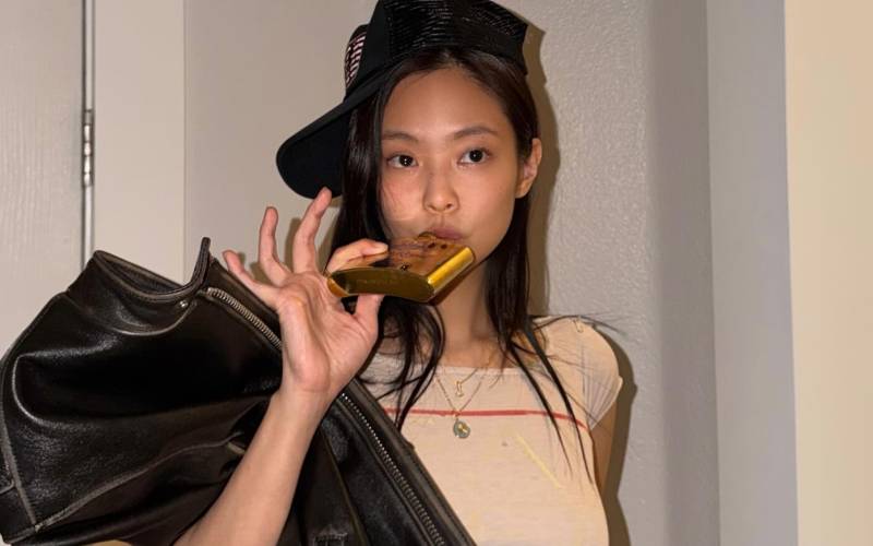 레드와 버터 컬러가 섞인 프린트 티셔츠에 트러커 햇을 비스듬히 얹어 장난기 있는 무드를 살렸다. 허리 라인을 드러내는 슬림한 티셔츠, 가죽 재킷, 골드 네크리스 레이어링. 익숙한 매치이지만, 트러커 햇 하나로 단번에 스트릿한 분위기 완성. 익숙한 아이템도 새롭게 풀어내는 제니의 스타일링 감각이 돋보인다.