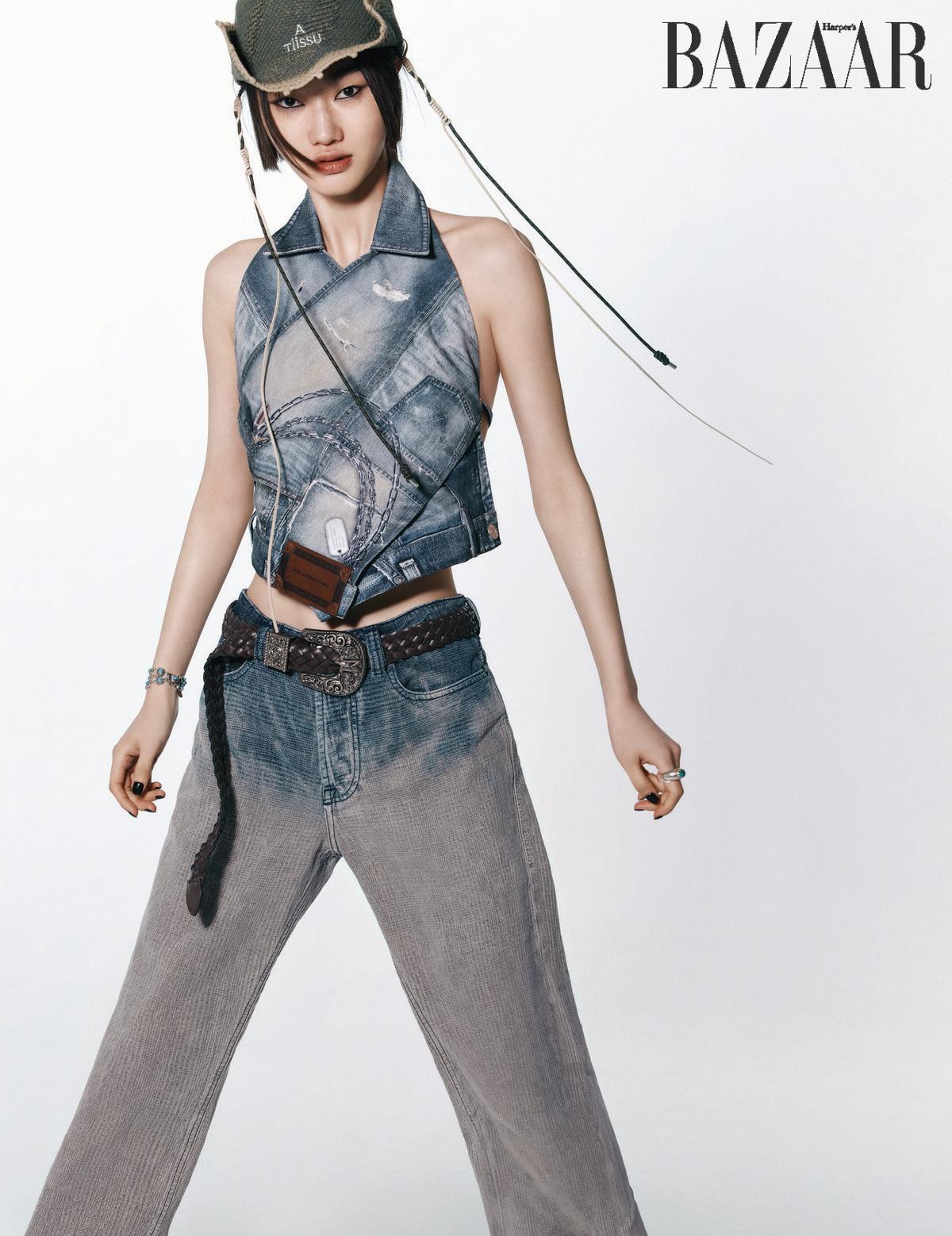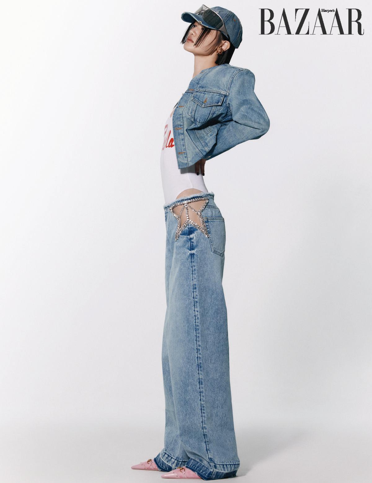 데님 재킷은 Celine. 바디 수트, 크리스털 비즈 장식 팬츠는 Stella McCartney H&M. 선글라스는 Acne Studios. 볼캡은 Diesel. 이어커프는 Hermès. 커프는 Celine. 펌프스는 Gucci.