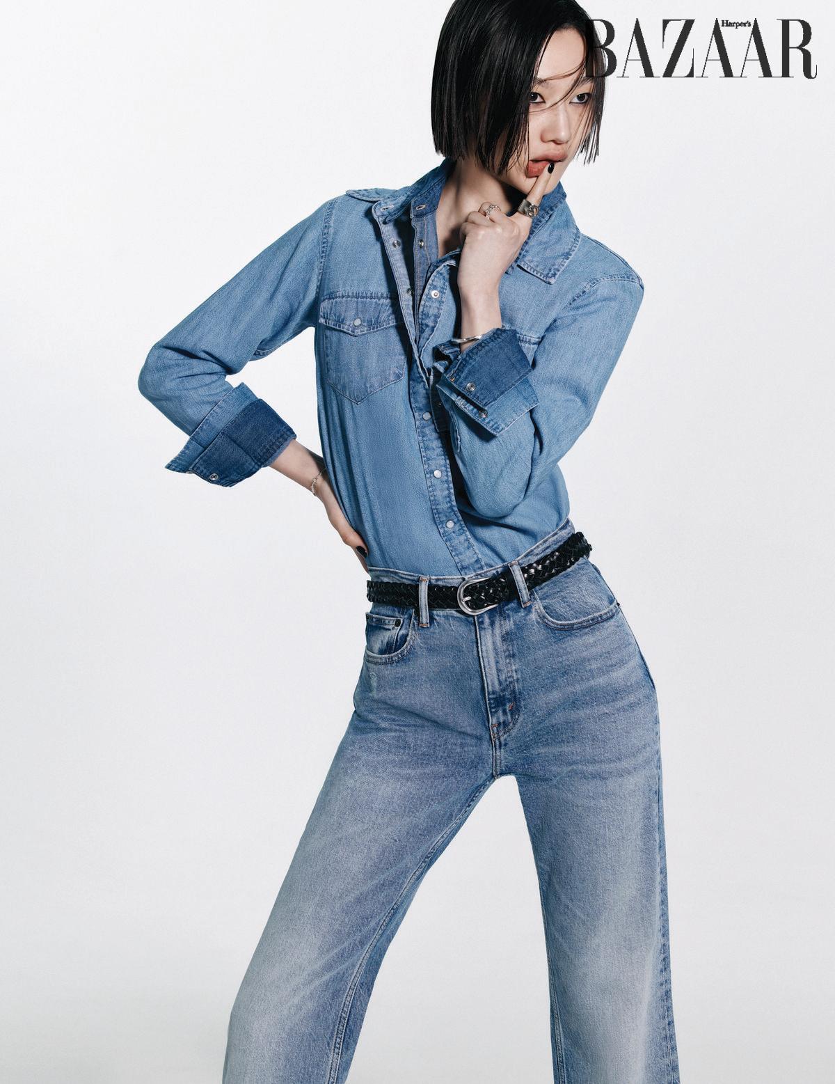 데님 셔츠는 9만9천원, 이너로 착용한 셔츠는 9만9천원 Levi’s. 팬츠는 37만9천원 Polo Ralph Lauren. 귀고리는 Chanel. 스카프는 Celine. 오른팔에 착용한 팔찌, 왼손 중지에 착용한 반지, 펌프스는 모두 Gucci. 오른손 중지에 착용한 반지, 왼손 검지에 착용한 반지는 Acne Studios. 브레이디드 벨트는 Studio Nicholson. 왼팔에 착용한 팔찌는 에디터 소장품.