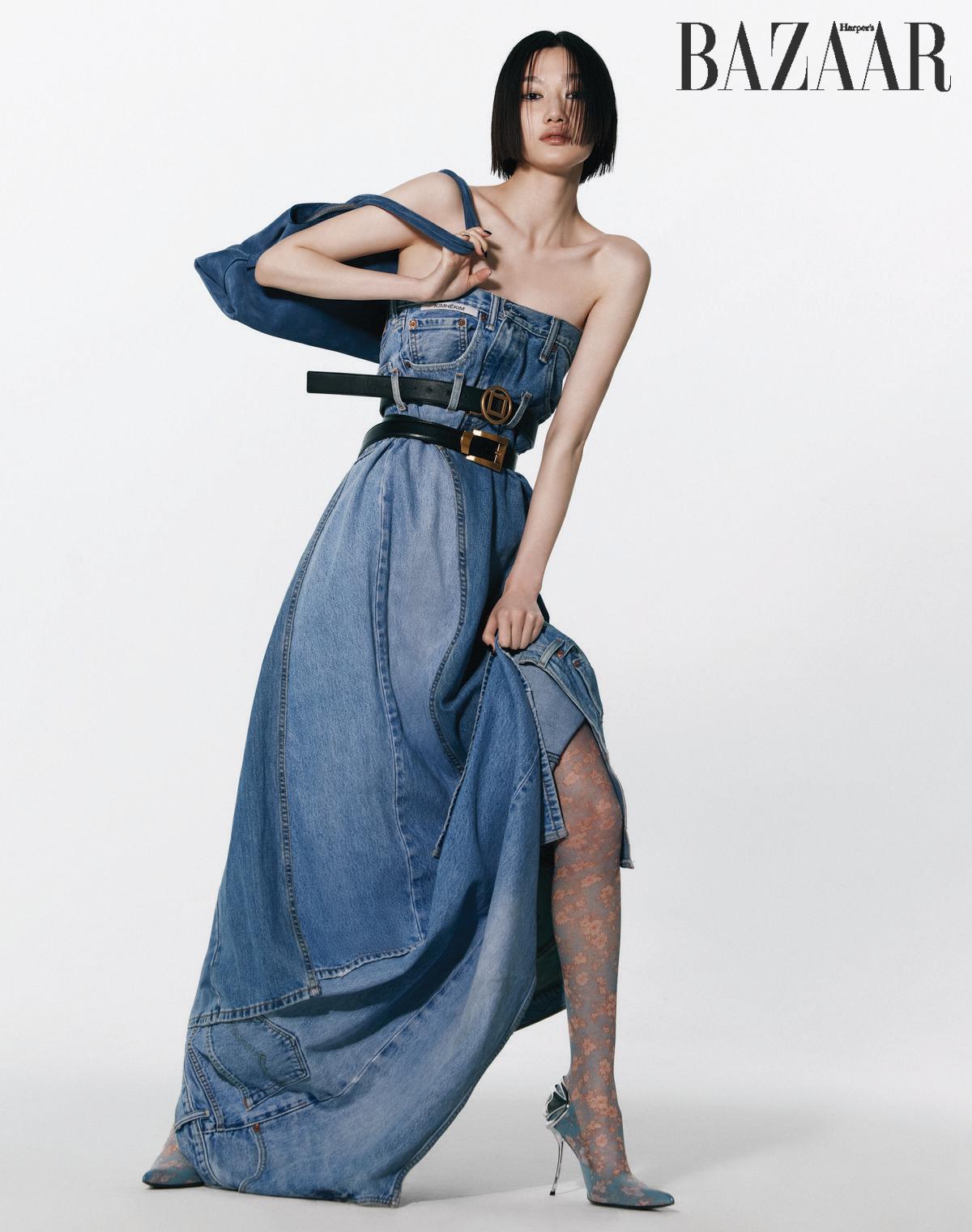 벨트 장식 튜브톱 드레스는 3백50만원 Kimhēkim. 아래 레이어드한 벨트는 Versace. 데님 토트백은 The Attico. 플로럴 프린트 사이하이 부츠는 Diesel.