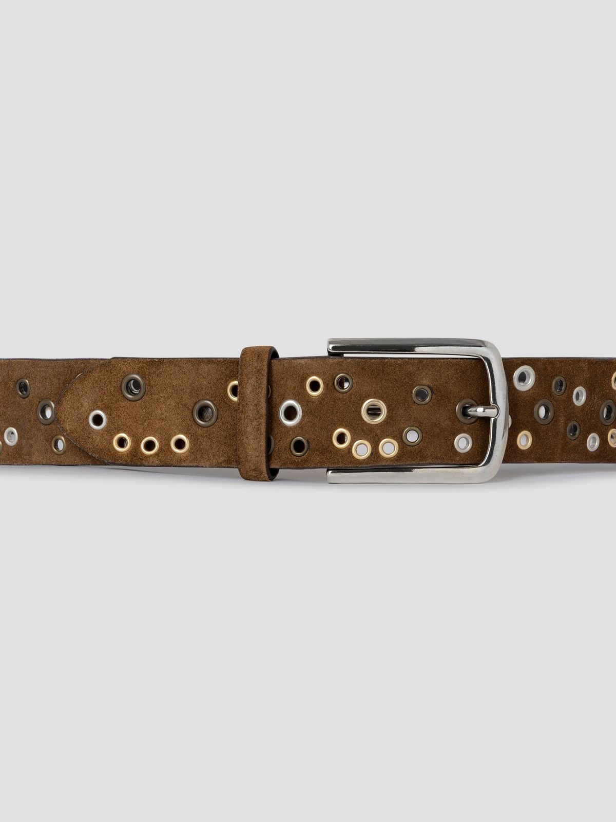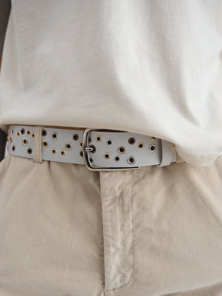 다양한 크기와 컬러의 아일렛이 불규칙하게 배치돼 Y2K와 빈티지 무드를 자아내는 벨트. 브라운 스웨이드는 웨스턴 감성을, 블랙과 화이트는 보다 모던한 인상을 더한다.