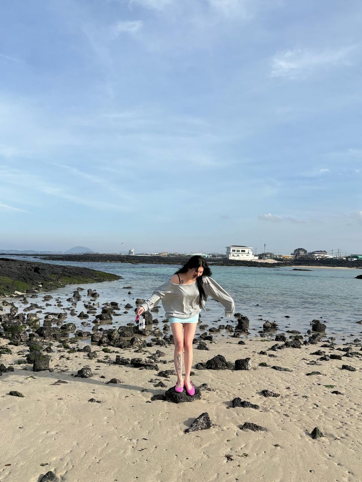 산뜻한 컬러감으로 화제를 모은 백예린의 해변 룩은 기마구아스 아이템들로 완성됐다. 맑은 스카이 블루 쇼츠는 자연스럽게 잡힌 주름 디테일로 스커트를 연상시키며, 플랫 슈즈는 비비드 핑크 위에 더해진 스터드 디테일로 단순한 룩에 확실한 포인트를 만든다. 백예린은 여기에 그레이 톱을 매치해 컬러의 균형을 잡았다.