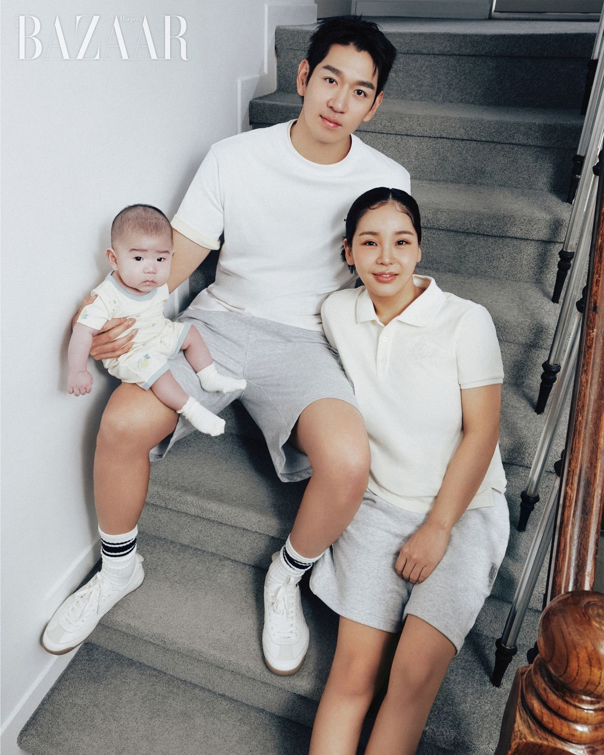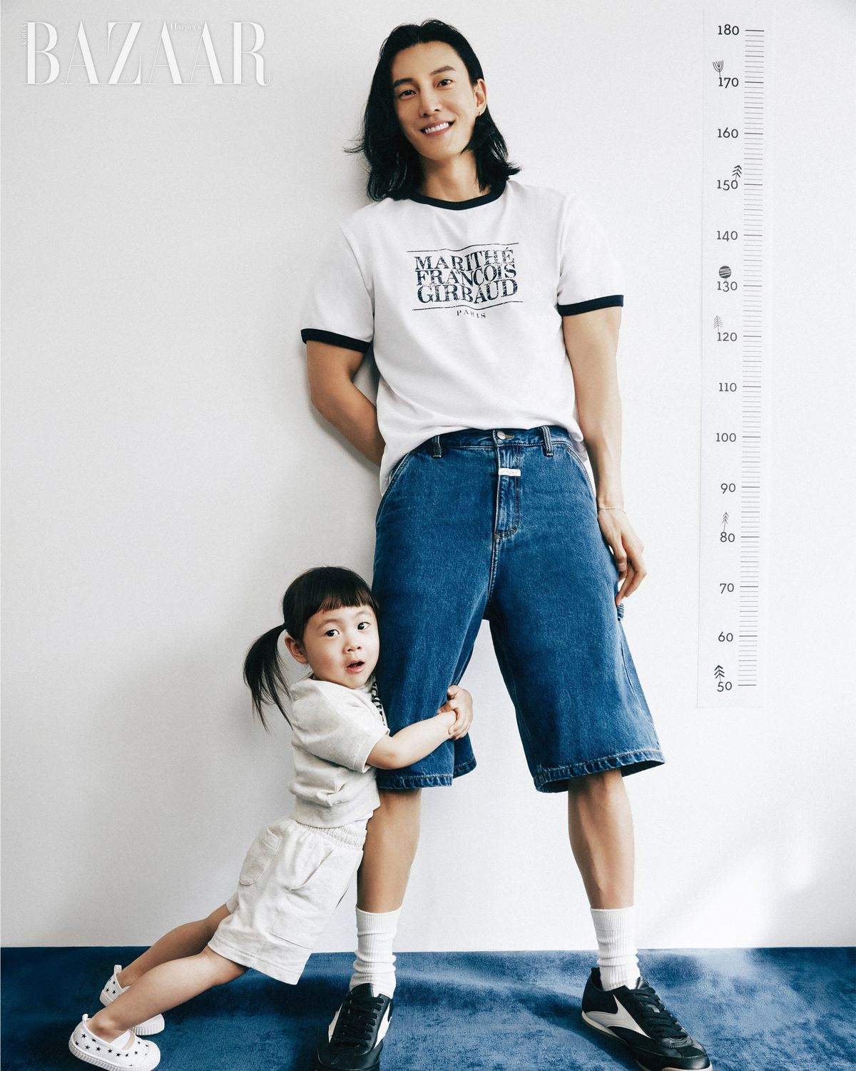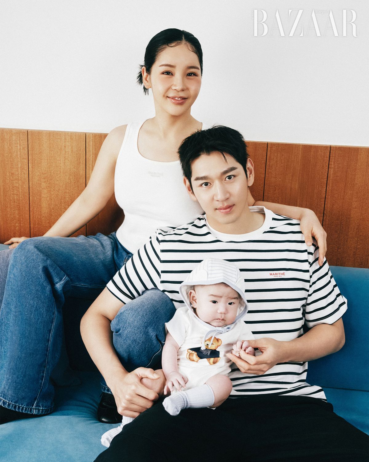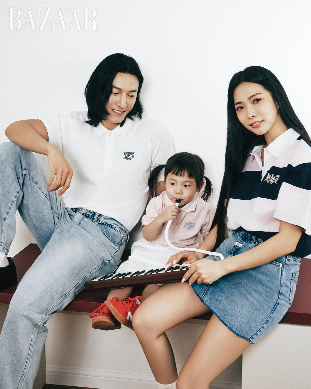 래온이 착용한 베어 프린트 보디수트, 스트라이프 보넷은 Marithé Kids. 트루디가 착용한 화이트 슬리브리스 톱, 데님 팬츠, 레이스업 스니커즈, 대은이 착용한 로고 티셔츠, 스웨트팬츠는 모두 Marithé François Girbaud