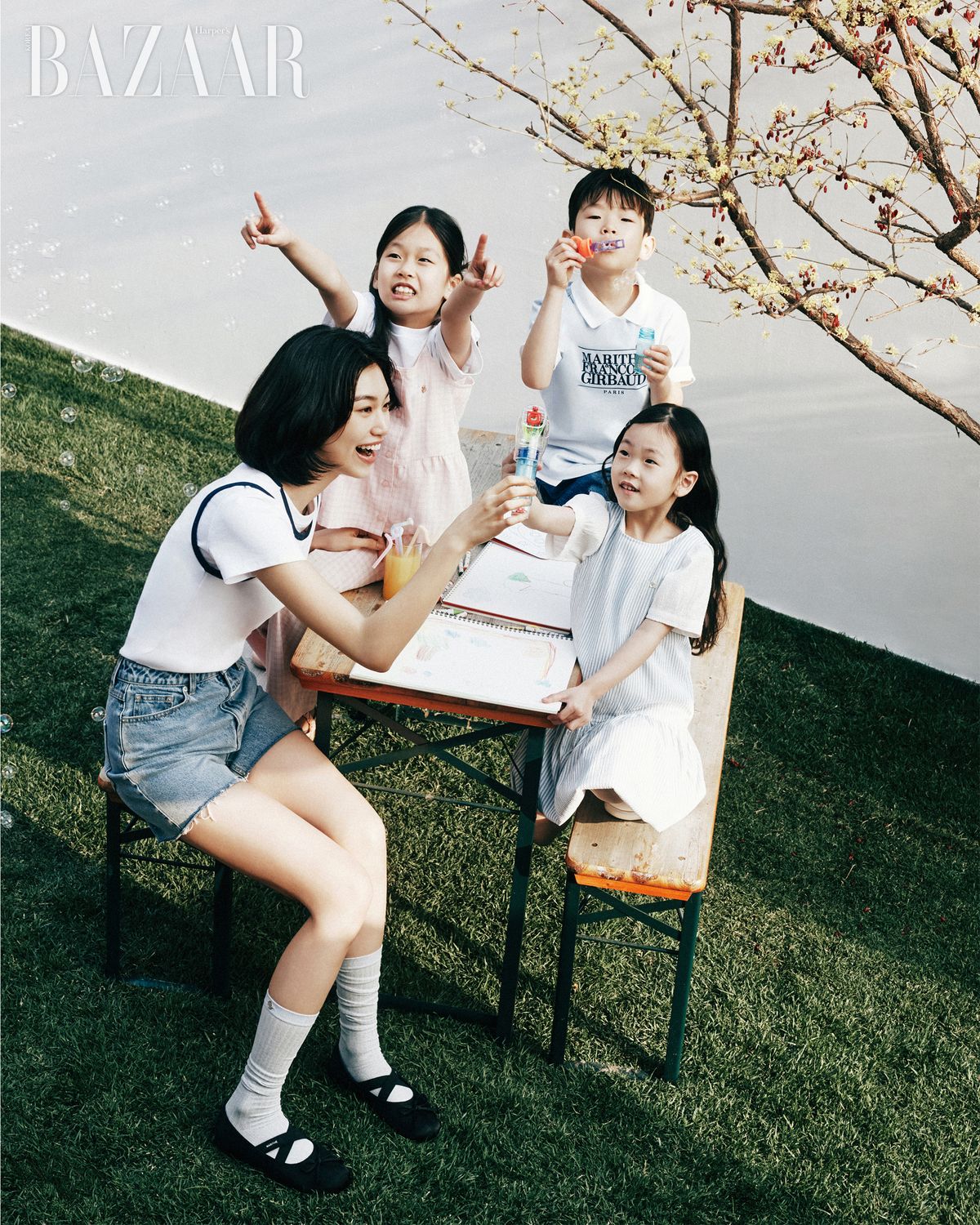 조카 지안이 착용한 시어서커 세일러 드레스, 스크런치 밴딩 포인트 플랫 슈즈, 조카 이서가 착용한 프릴 슬리브리스 티셔츠, 스트라이프 패턴 니트 뷔스티에, 데님 쇼츠, 니삭스, 코튼 벨크로 스니커즈, 조카 지우가 착용한 멀티컬러 스트라이프 칼라 티셔츠, 베어 프린트 데님 팬츠, 베어 코튼 슬립온은 모두 Marithé Kids. 도연이 착용한 케이블 니트 카디건, 부츠컷 데님 팬츠, 폴더블 레이스업 스니커즈는 모두 Marithé François Girbaud.