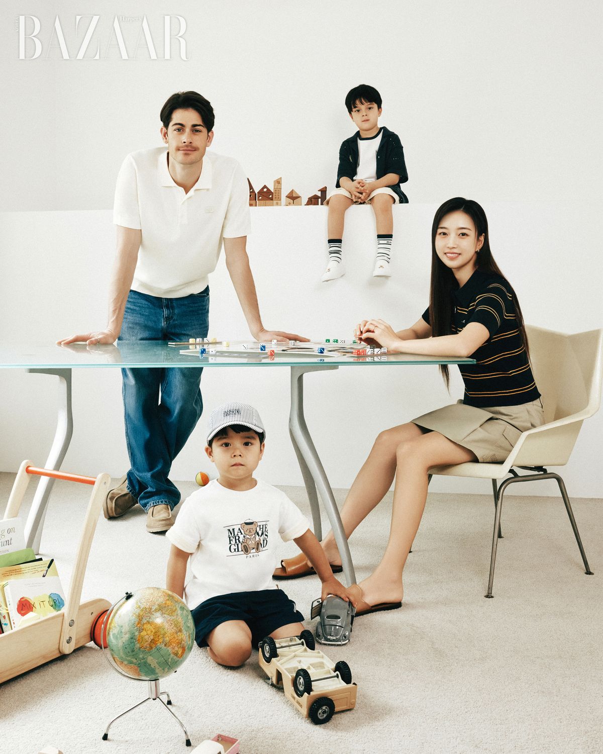 래온이 착용한 레몬 베어 올오버 프린트 보디수트와 팬츠는 Marithé Kids. 대은이 착용한 베이지 로고 티셔츠, 화이트 로고 티셔츠, 스웨트 쇼츠, 트루디가 착용한 피케 셔츠, 스웨트 쇼츠는 모두 Marithé François Girbaud.