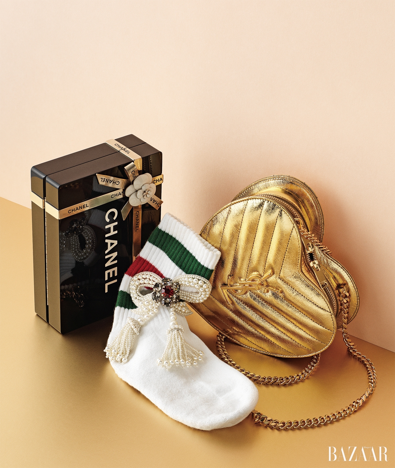 (왼쪽부터) 카멜리아 리본으로 장식된 기프트 박스 형태의 클러치 백은 가격 미정으로 Chanel, 진주와 크리스털 소재의 리본이 달린 양말은 61만원으로 Gucci, 메탈릭한 질감이 화려한 하트 모양 클러치 겸 체인 숄더백은 4백22만5천원으로 Saint Laurent by BOONTHESHOP