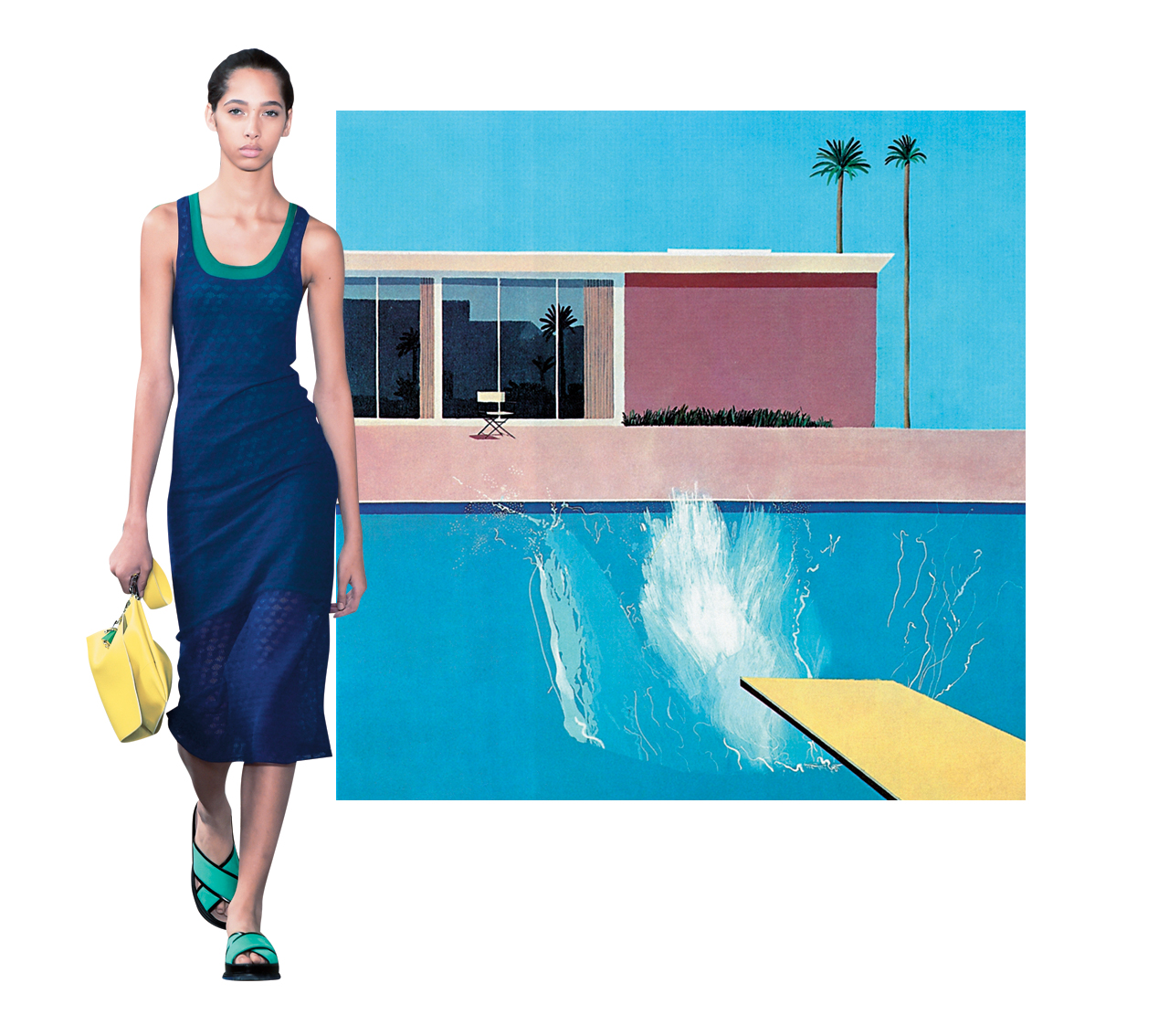 잘 짜인 니트 드레스와 끈으로 매듭 지은 가벼운 탱크 톱, 시폰 소재 원피스까지 페미닌한 무드에 실용성과 스포티함을 적절히 버무려낸 보스 컬렉션에서 가장 눈길을 끌었던 건? 바로 룩에 생동감을 한가득 불어넣은 블루와 그린을 중심으로 한 비비드한 컬러 조합! 이는 영국의 팝아티스트 데이비드 호크니(David Hockney)의 대표 작품인 ‘풀 시리즈’를 재해석한 것으로 이 컬러 팔레트는 쇼장 설치물에도 고스란히 활용되었다.