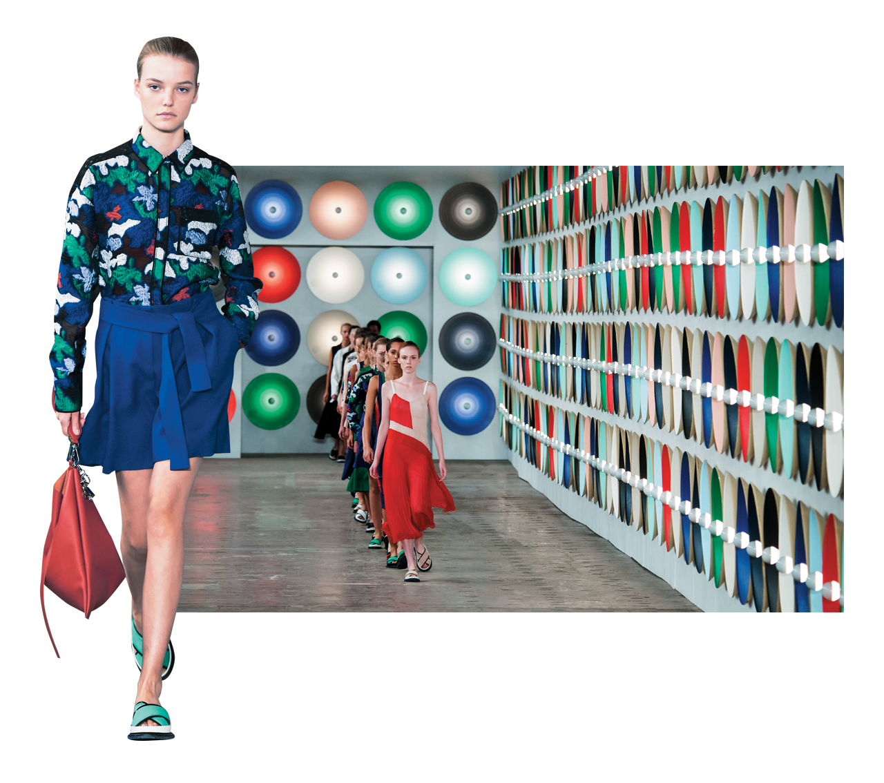 ‘반사와 반영’의 의미를 담은 설치미술가 댄 그레이엄의 작품에서 공통점을 발견한 피비 파일로는 이번 시즌 셀린의 쇼장을 댄 그레이엄의 전시장으로 택했다. 여기에 이번 쇼만을 위해 특별히 만든 거대한 S자 모양 유리 벽을 쇼장 중간에 설치했고 모델들은 그 곡선을 따라 런웨이를 걸어 나왔다. 런웨이 쇼 중간 화이트 드레스에 강렬하게 입혀진 푸른색 프린트는 누보 레알리슴의 선두주자 이브 클라인의 작품 ‘청색 시대의 인간측정학(Anthropometry of The Blue Period)’.