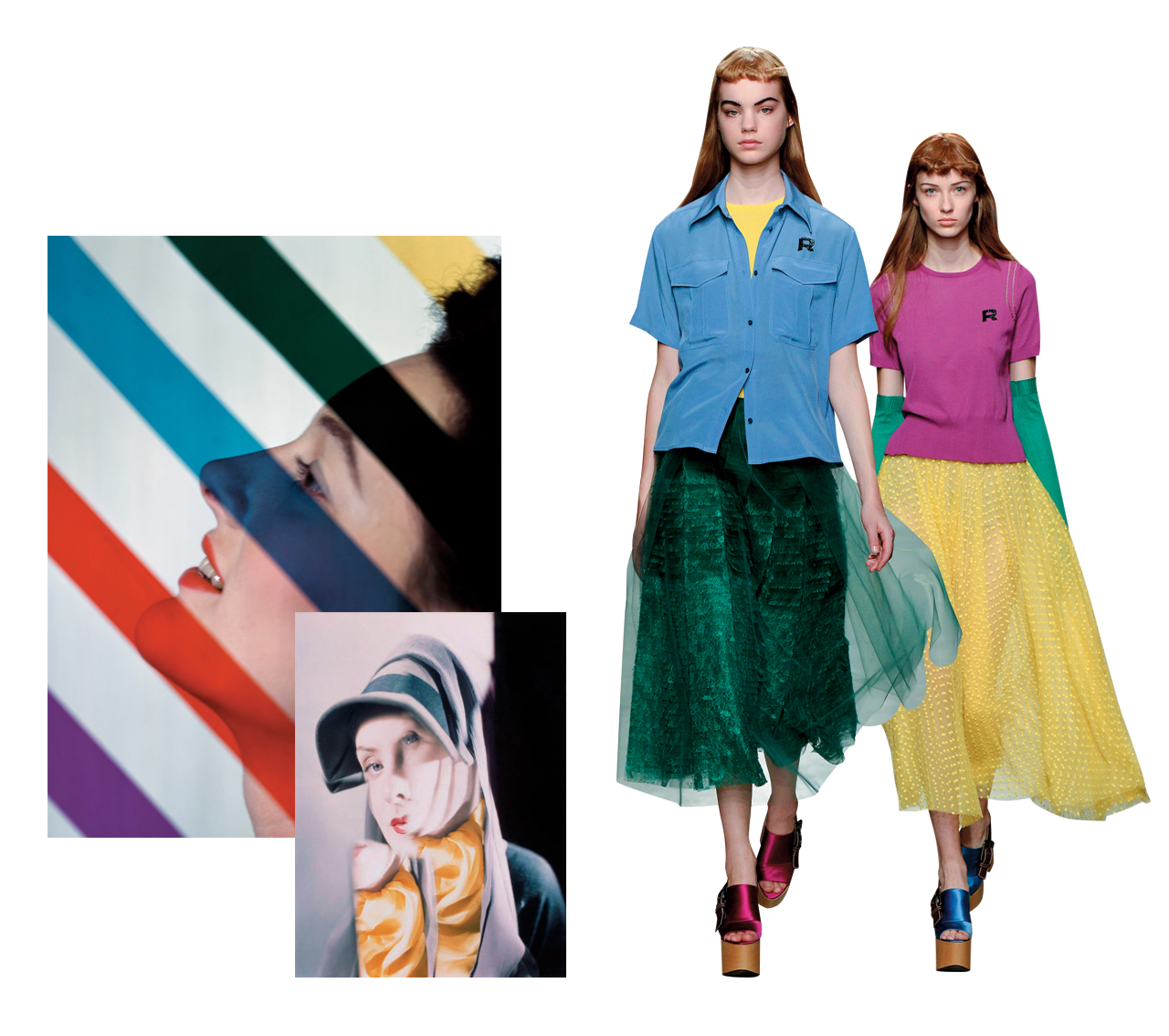 이번 시즌 1940~50년대 초현실주의 패션사진가 에르빈 블루멘펠트의 작품에서 힌트를 얻은 로샤스의 알레산드로 델라쿠아. 드레이프와 러플 디테일의 드레스부터 매니시한 셔츠에 매치한 튤 스커트에 옐로, 블루, 마젠타, 그린 등의 컬러 팔레트를 절묘하게 조합해 환상적인 컬러 플레이를 선보였다.