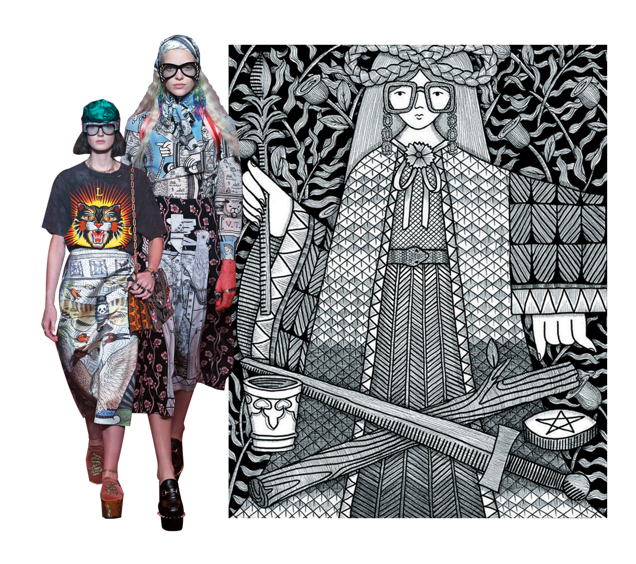 타로 카드를 모티프로 판타지한 세계를 그리는 작업을 지속해오고 있는 아티스트 제이드 피시(Jayde Fish)와 구찌가 만났다. 제이드 피시는 자신의 작업을 해시태그 ‘#AlessandroMichele’와 함께 업로드했고 이를 우연히 접한 알레산드로 미켈레가 러브콜을 보낸 것. 그녀의 독특하면서도 정교한 손길은 호랑이 티셔츠, 르네상스풍의 드레스와 만나 구찌의 드라마틱한 판타지를 더욱 증폭시켰다.