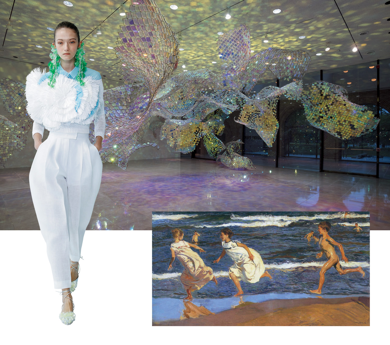빛에 대해 공부를 시작했다는 델포조의 크리에이티브 디렉터 조셉 폰트는 이번 시즌 빛을 다루는 그림의 대부인 스페인 출신의 호아킨 소로야와 다양한 빛의 굴절과 반사를 다루는 한국계 미국인 설치미술가 수 서니 박(Soo Sunny Park)의 작품을 런웨이에 담아냈다. 호아킨 소로야의 빛나는 지중해 풍경은 페미닌한 볼륨감의 셔츠나 스커트, 독특한 플로럴 프린트 등으로 완성되었고 비비드한 색감과 달콤한 컬러 팔레트로 가득 채워졌다. 또한 메탈릭한 메시와 보는 각도에 따라 색이 바뀌는 플유시 유리를 이용한 작업 ‘Unwoven Light’ 시리즈를 만든 수 서니 박의 설치물은 델포조의 룩과 완벽하게 어우러졌다.