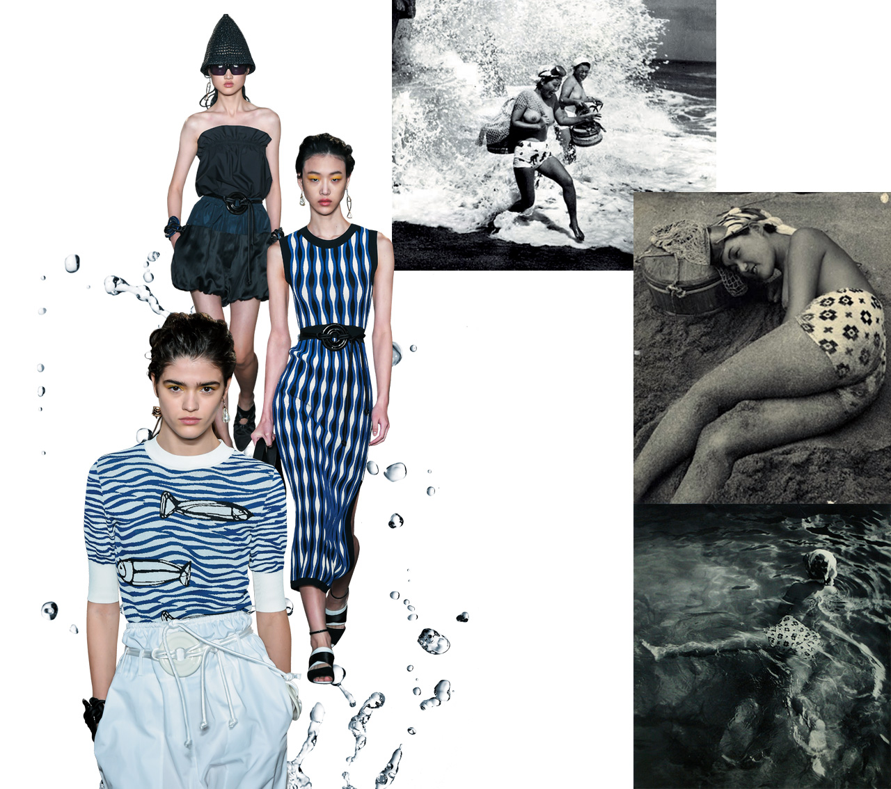 스포트막스의 이번 컬렉션은 1980년대 초반 선보였던 일본 포토그래퍼 쿠스카주 아라구치의 사진집 <아마의 해녀들(Shima No Ama)>에서 시작되었다. 파도 사이를 넘나들며 진주를 채취하는 해녀들의 낙천주의를 표현하고자 했다는 쇼는 물고기 패턴의 니트부터 스트로 비니, 금빛 물고기 귀고리, 플라스틱 소재의 낚시 바구니를 닮은 뉴 백 ‘SM207’로 재탄생했다.