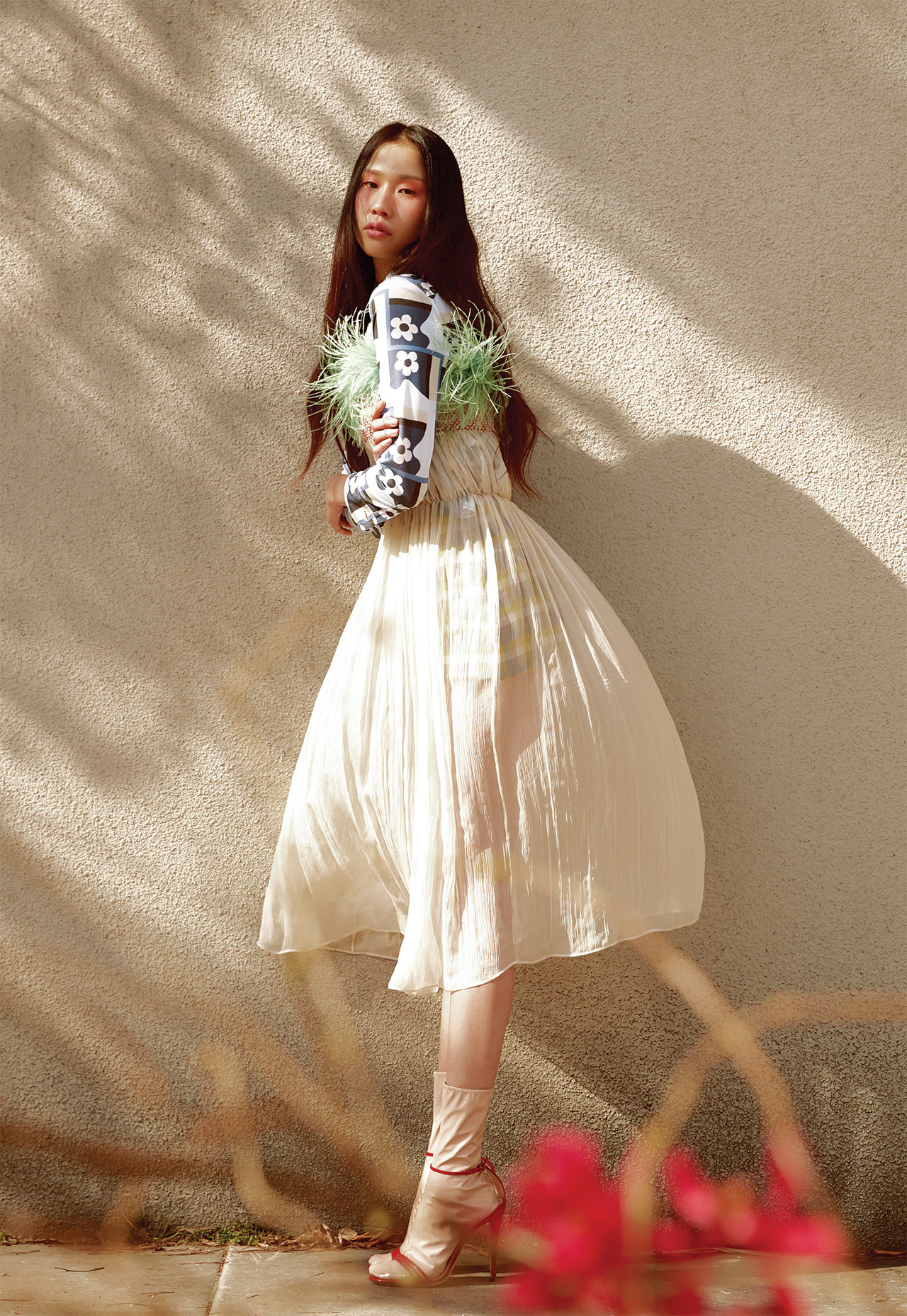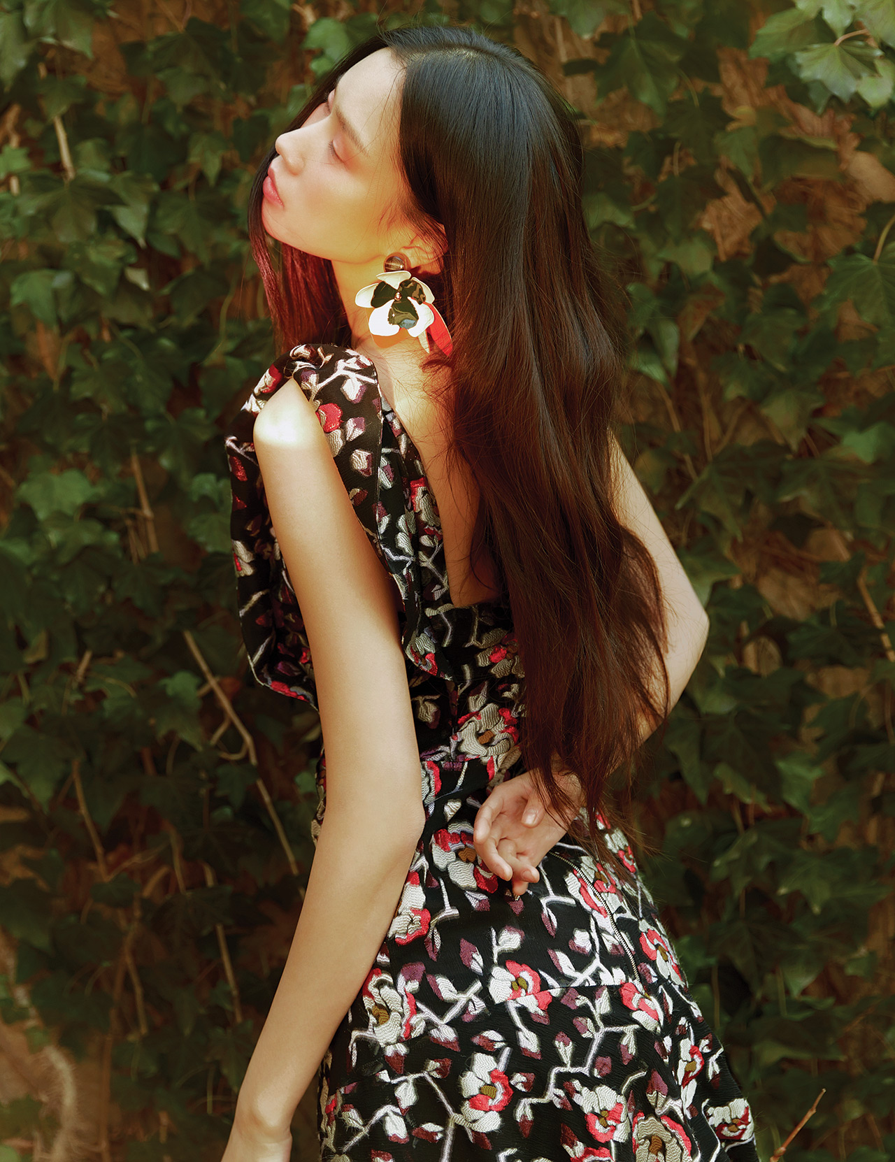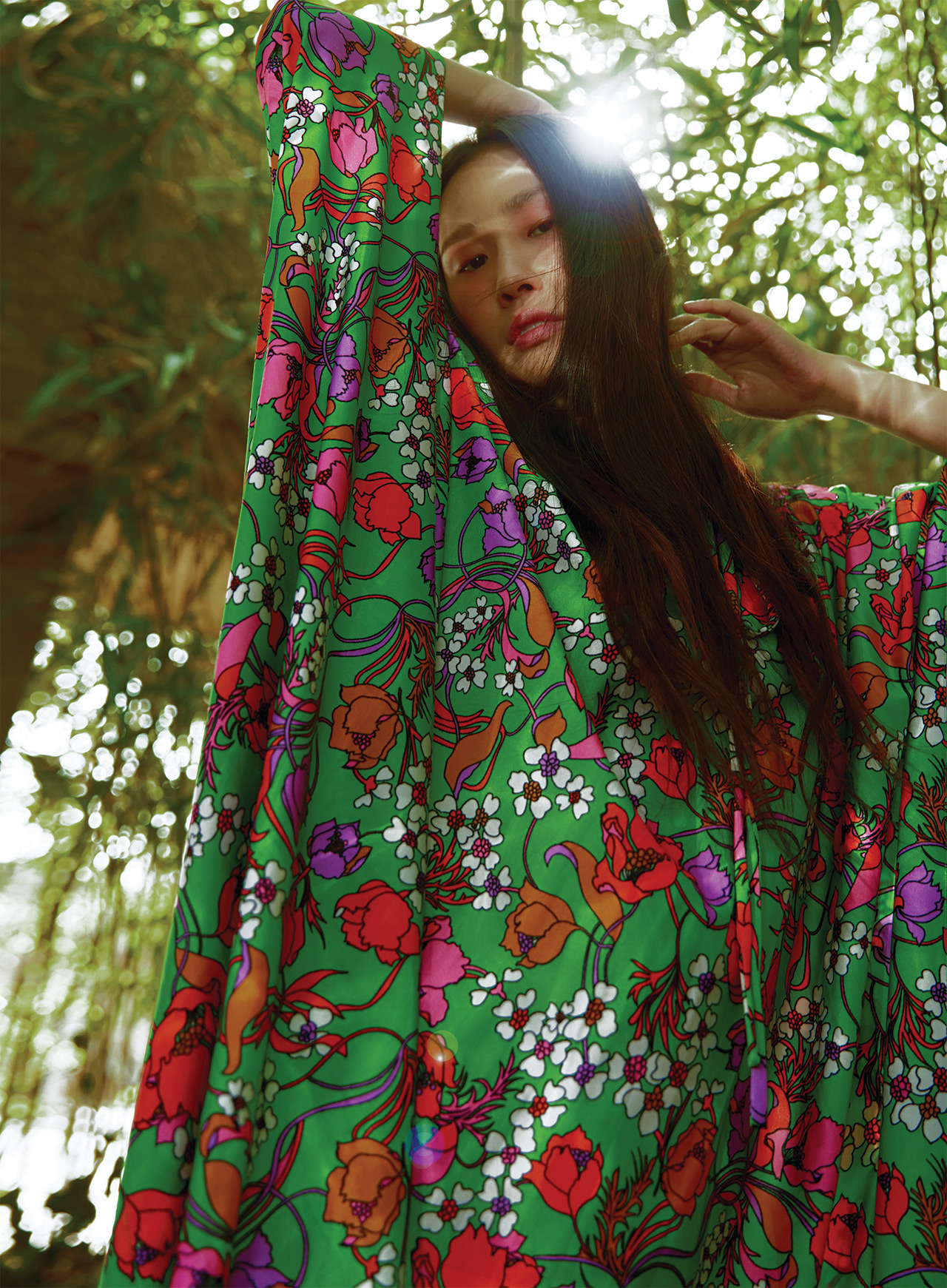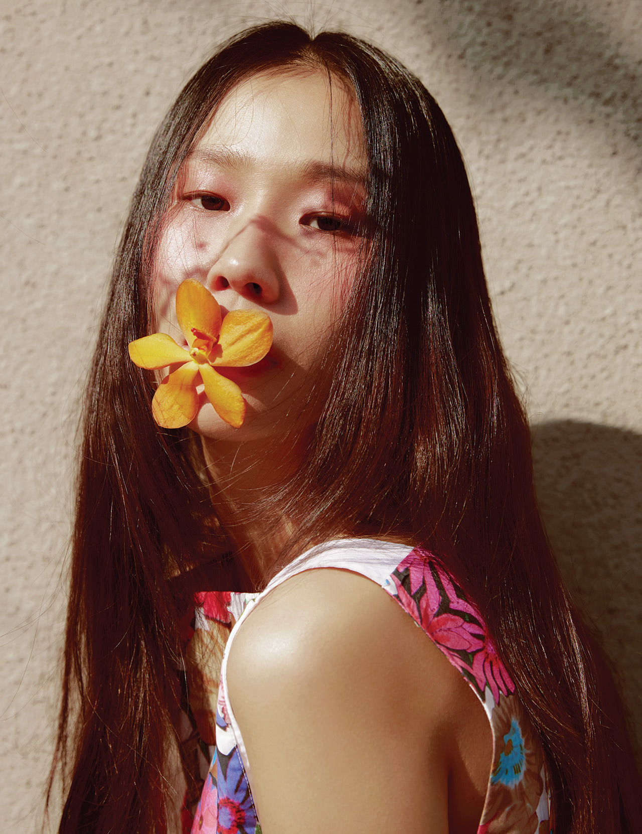 나른한 봄, 다채로운 컬러와 패턴의 꽃으로 치장한 여인의 초상.