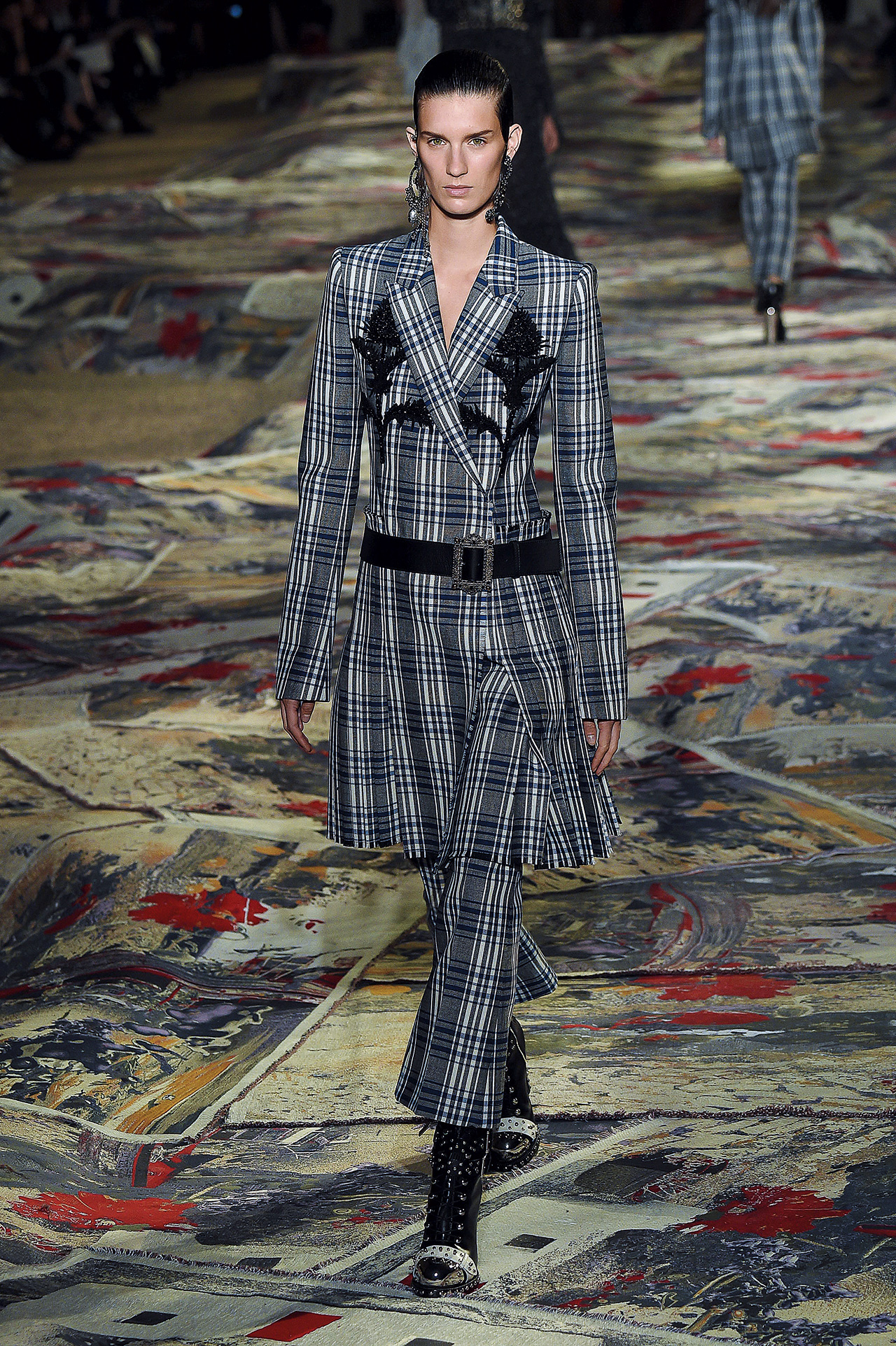 반면 킬트(Kilt)를 덧입은 것 같은 맥퀸의 팬츠수트는 색다른 이브닝 룩을 위한 새로운 방향성을 제시한다. 선명한 타탄체크부터 완벽한 테일러링, 블랙 플라워 자수 장식, 앤티크한 새틴 벨트, 밑단이 적당하게 넓어지는 팬츠 실루엣까지, 모든 요소가 빈틈없이 조화를 이룬 이 수트는 꼭 한 벌로 그대로 입어보길 바란다. 쇼에서처럼 양쪽 디자인이 다른 오버사이즈 귀고리를 더한다면 보다 완벽할 것.