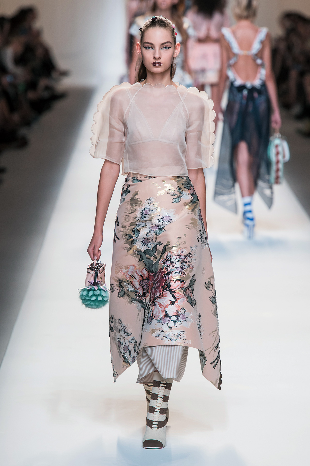 지난 2월호 <바자>에 실린 피에르파올로 피치올리의 인터뷰 기사에서도 짐작할 수 있듯 이번 시즌 발렌티노 쇼에서는 르네상스 아트, 그중에서도 15세기 작품인 히에로니뮈스 보슈의 ‘세속적 쾌락의 정원’에서 영감을 받은 룩들이 등장했다. 과거와 현재를 자유롭게 넘나든 그의 의상들은 동화 같은 동시에 무척이나 섬세했고 또 우아했다. (관련기사: 런웨이 아트 투어)
