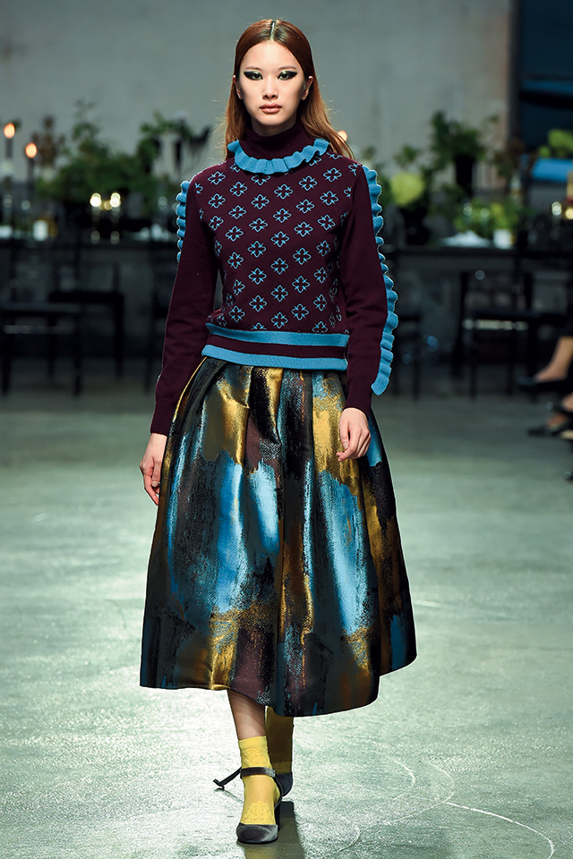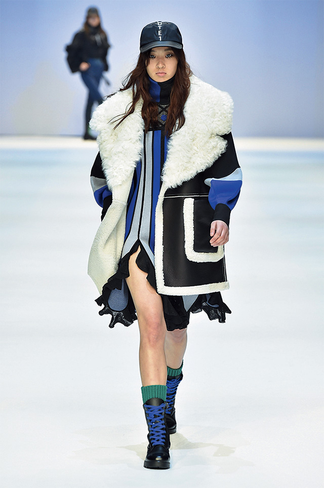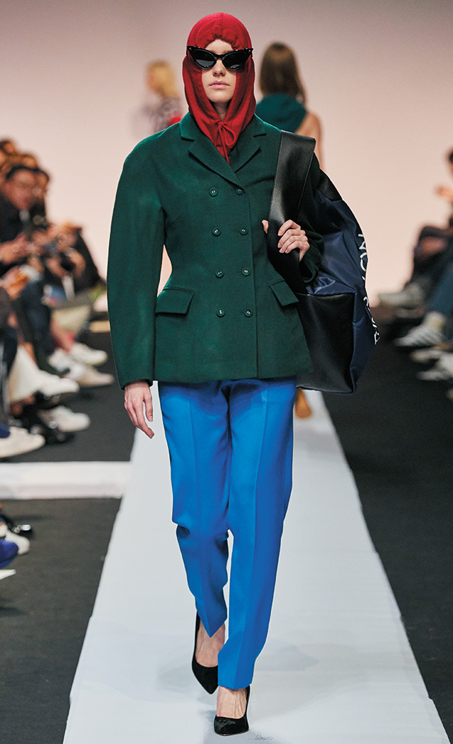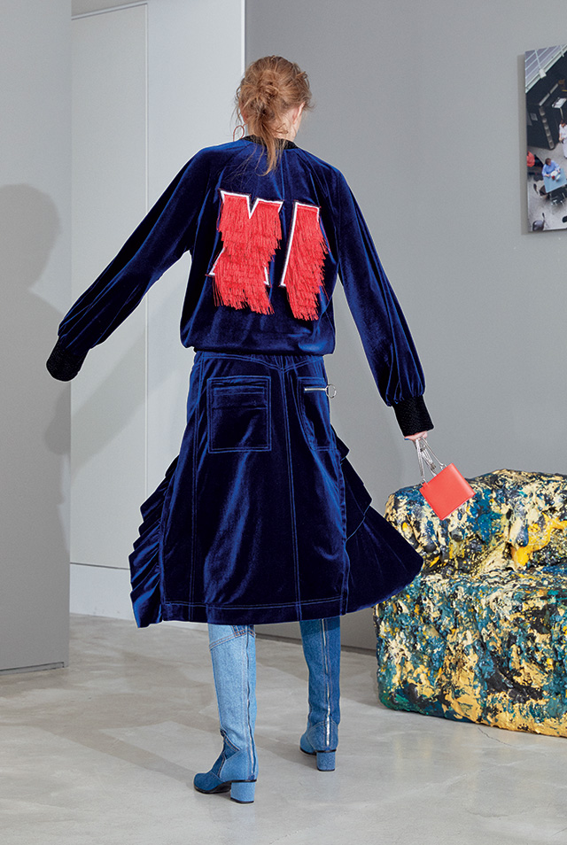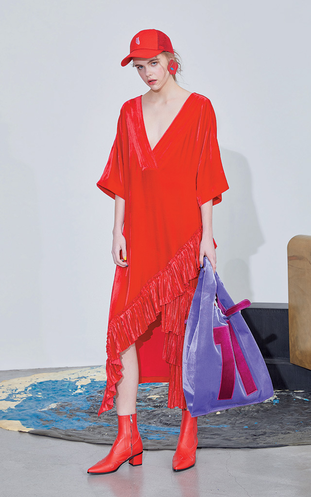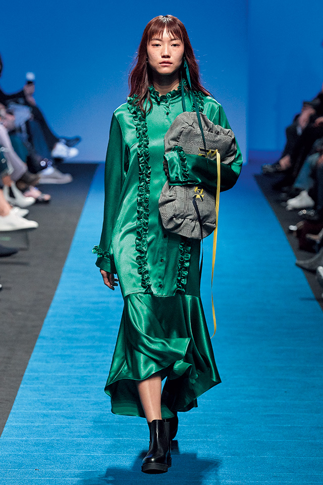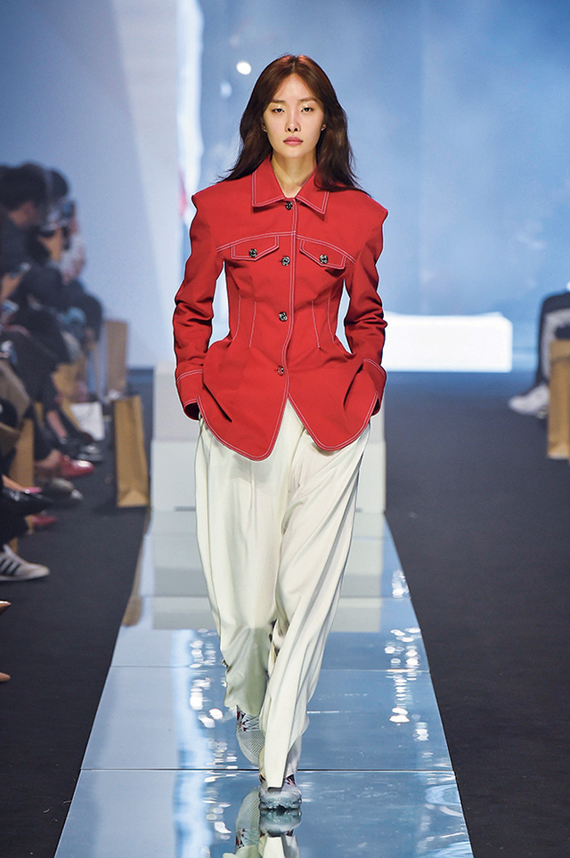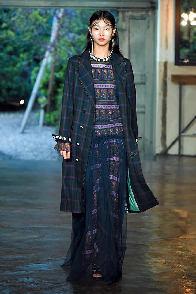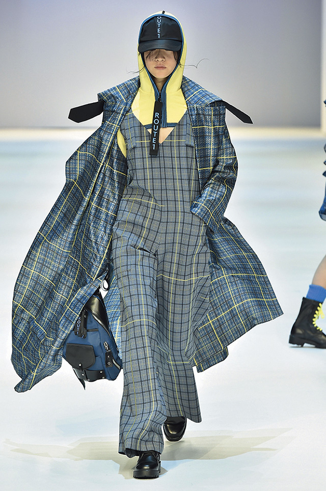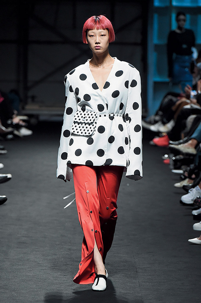 론칭 10주년을 맞은 프리마돈나는 ‘셀러브레이션’을 주제로 자축 파티를 열었다. 그래서인지 그녀만의 걸리시한 무드에서 좀 더 성숙해진 모습이 보였는데, 일하는 여자들에게서 영감을 받았다는 그녀의 말대로, 작업복의 굵은 스티치를 넣고 루스하게 떨어지는 실루엣으로 여유를 강조한 것. 여기에 나이키의 베이퍼맥스 슈즈를 선택해 스포티하고 실용적인 무드로 전반적인 룩을 마무리했으며, 볼드한 체크 패턴과 레드 컬러 포인트로 경쾌함도 잃지 않았다.