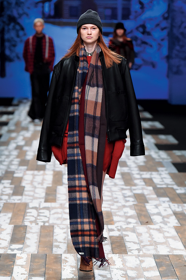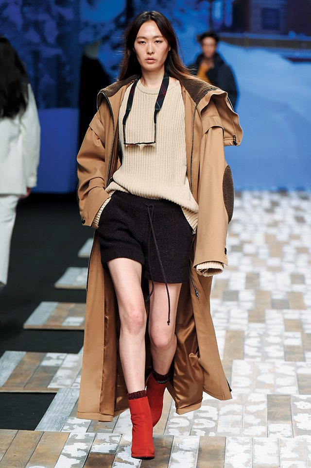 눈 쌓인 한적한 별장을 런웨이로 연출한 노앙의 컬렉션은 겨울 산장에 머물고 있는 다양한 사람들의 모습을 웨어러블하고 캐주얼한 감성으로 풀어냈다. 데님, 스웨트셔츠, 무톤, 패딩 등 베이식한 아이템에 브라운, 레드, 블루, 머스터드 등 다양한 컬러와 패턴을 믹스해 생동감을 더했다. 런웨이에 등장한 사랑스러운 어린이 모델과 디자이너의 반려견인 ‘노루’의 노련한 워킹 역시 관전 포인트!