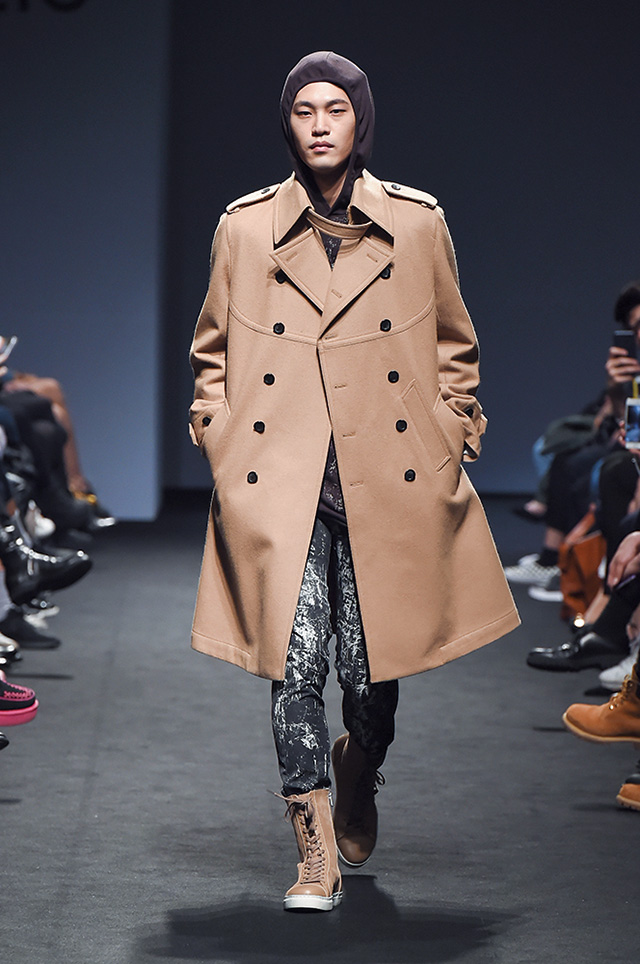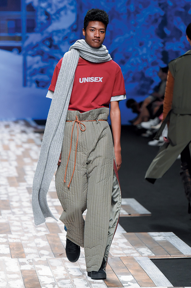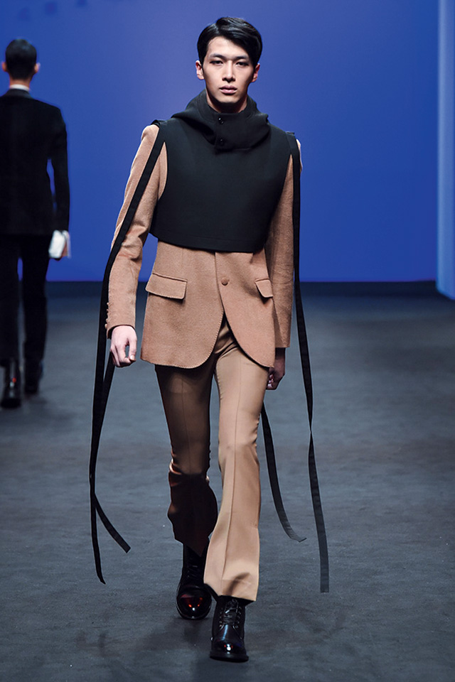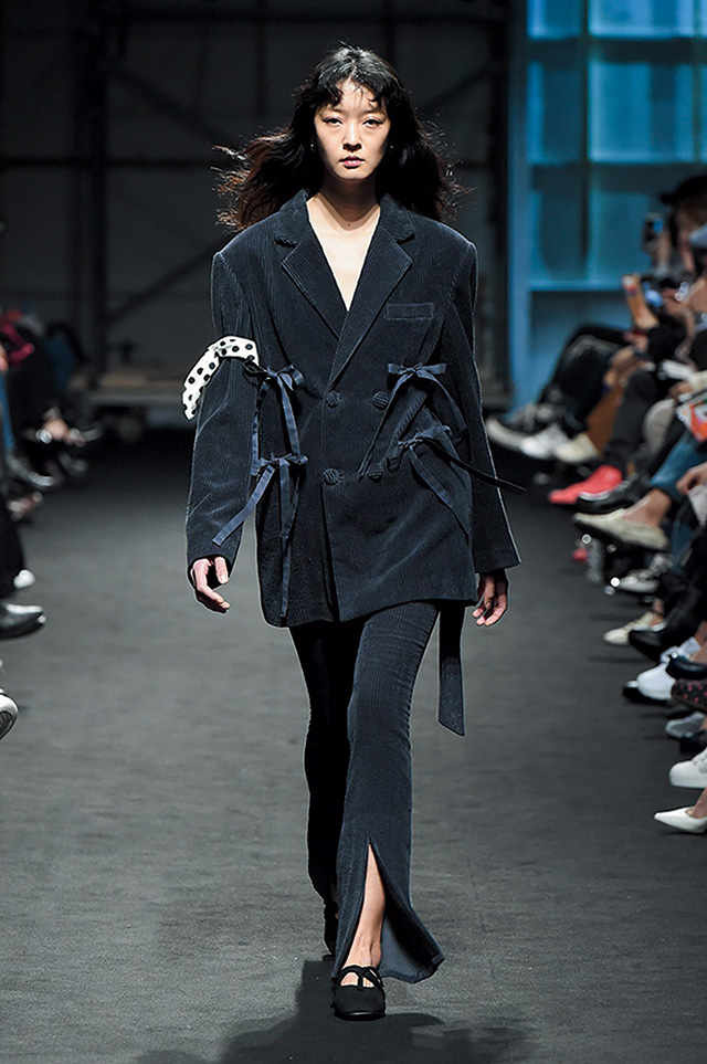 고전적인 룩과 스트리트 룩을 자유자재로 넘나드는 박승건의 장기가 빛났던 쇼. 어깨가 강조된 셔츠와 재킷, 코트는 비비드한 컬러 매치로 생동감이 느껴졌고, 가공되지 않은 데님과 벨벳 소재의 쿨한 아이템이 눈길을 끌었다. 잘록하게 허리가 들어간 클래식 재킷에 히잡처럼 후디를 매치한다거나 니트 소재의 손가락 장갑을 스타일링의 포인트로 활용하는 등 특유의 위트도 느낄 수 있었다.