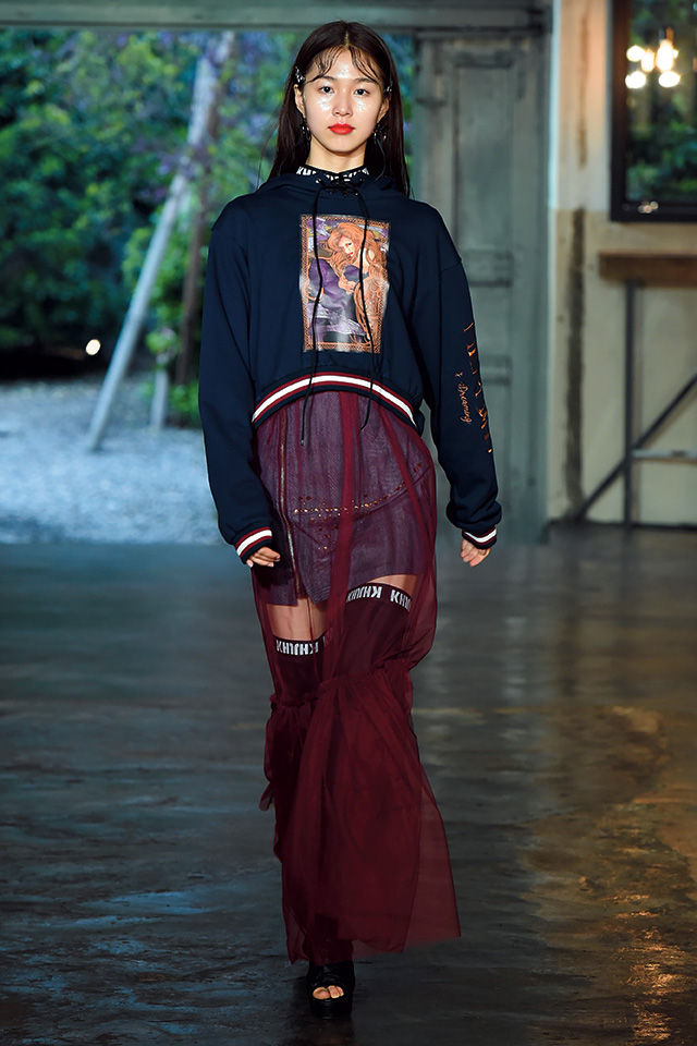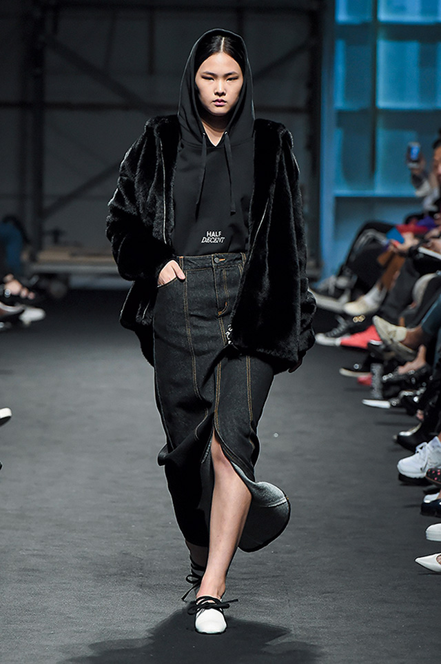 디자이너 곽현주는 애니메이션 <인어공주>에서 영감을 받아 쇼를 완성했다. 전반적으로 스포티한 감성의 스트리트 룩이 주류를 이뤘고, 인어공주 프린트의 후디에 튤 소재의 롱스커트를 매치한 룩이 눈길을 끌었다. 이 밖에도 인어공주의 눈물을 연상케 하는 진주, 러브스토리를 담은 ‘4랑’이라는 레터링 포인트 등 영감에 매우 충실했던 쇼.