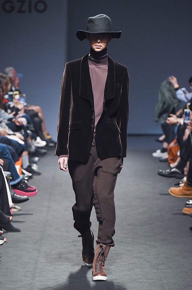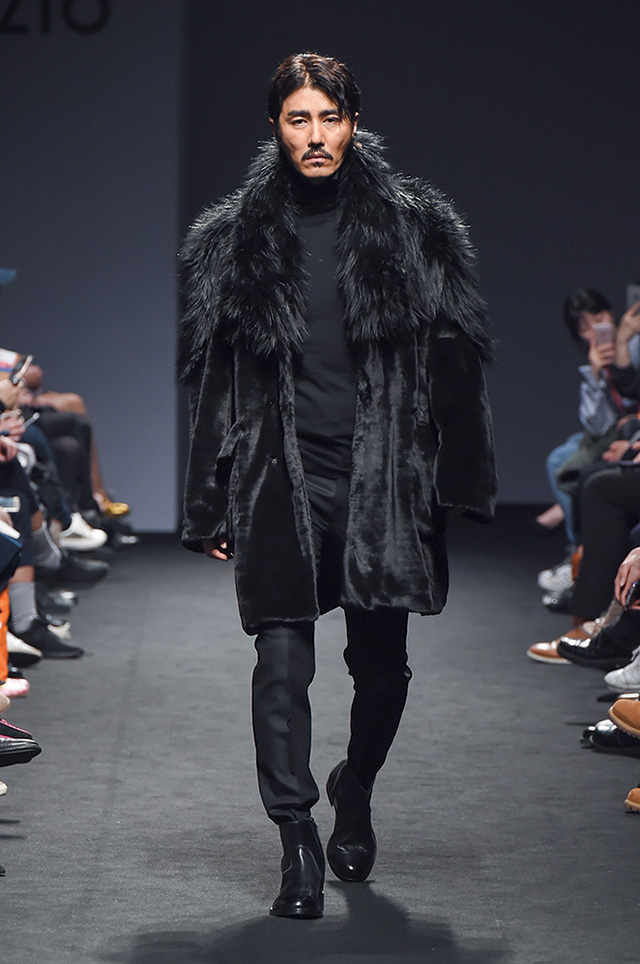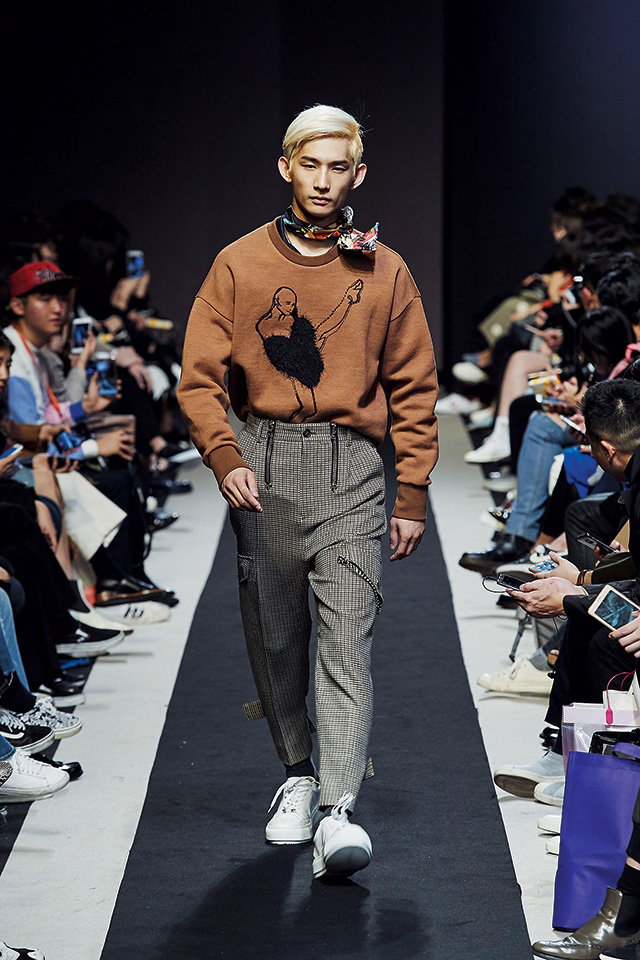 세상을 회의적으로 바라보는 염세주의자의 감정 변화를 이야기한 디자이너 송지오. 견고한 블랙 수트로 시작된 쇼는 어두운 내면을 반영한 일러스트와 패턴이 적용된 다양한 실루엣과 소재의 의상들로 이어졌다. 쇼 중반에 캐멀과 오렌지 컬러가 등장하며 잠시 마음에 깃든 따스한 감정을 표현했지만, 결국 블랙 컬러로 컬렉션은 마무리되었다.