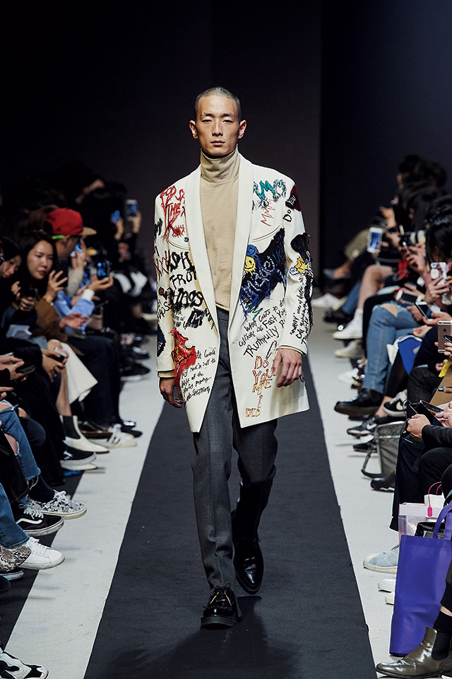 전통 발레의 형식에서 벗어나 펑키하고 자유분방한 무대를 통해 사회적 메시지를 전달한 무용수 마이클 클락(Michael Clark)에게 영감 받은 커스텀 멜로우. 낙서 프린트와 패치워크가 가득한 화이트 재킷을 입고 등장한 모델 박성진을 필두로 펑키한 디테일과 남성복의 모던한 테일러링 요소가 위트 있게 조화를 이룬 쇼였다.