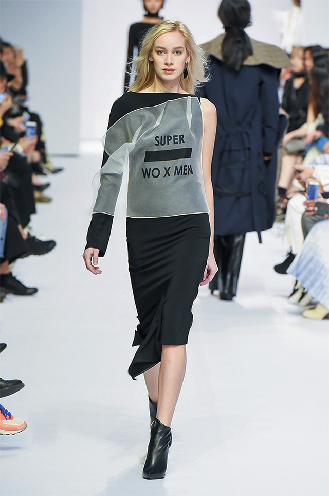 노케도 이번 시즌 페미니즘 트렌드에 동참했다. 컬렉션에 반복적으로 사용된 ‘슈퍼우먼’이라는 슬로건을 비롯해 남성적인 수트와 터프한 가죽 소재로 만들어진 구조적인 의상들은 캐서린 헵번, 마돈나 등 뚜렷한 자아와 에너지로 시대를 풍미했던 여성들에게서 영감을 얻은 것이라고.