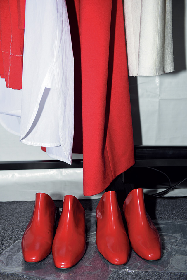 최근 연극 <메디아>의 무대의상을 맡은 디자이너 진태옥의 런웨이는 <메디아> 속 한 장면을 연상시켰다. 런웨이에 우뚝 선 마네킹들의 검은 장막을 걷어내자, 구조적인 조각상과도 같은 다양한 레드 드레스들이 드러났고 피날레 역시 다양한 소재와 실루엣의 레드 룩으로 연극의 클라이맥스를 떠올리게 한 것. 이와 함께한 건 카키, 버건디, 그레이, 브라운, 토파즈 블루 등 선명한 컬러와 깊이감을 더하는 벨벳 소재의 만남이었다. 어깨, 소매, 길이, 그리고 바지 통까지 극대화된 실루엣을 선보였는데 허리라인을 강조하거나 사랑스러운 라펠을 더하고 부드러운 시폰 리본을 흩날림으로써 진태옥만의 가녀린 여성미 또한 놓치지 않았다.