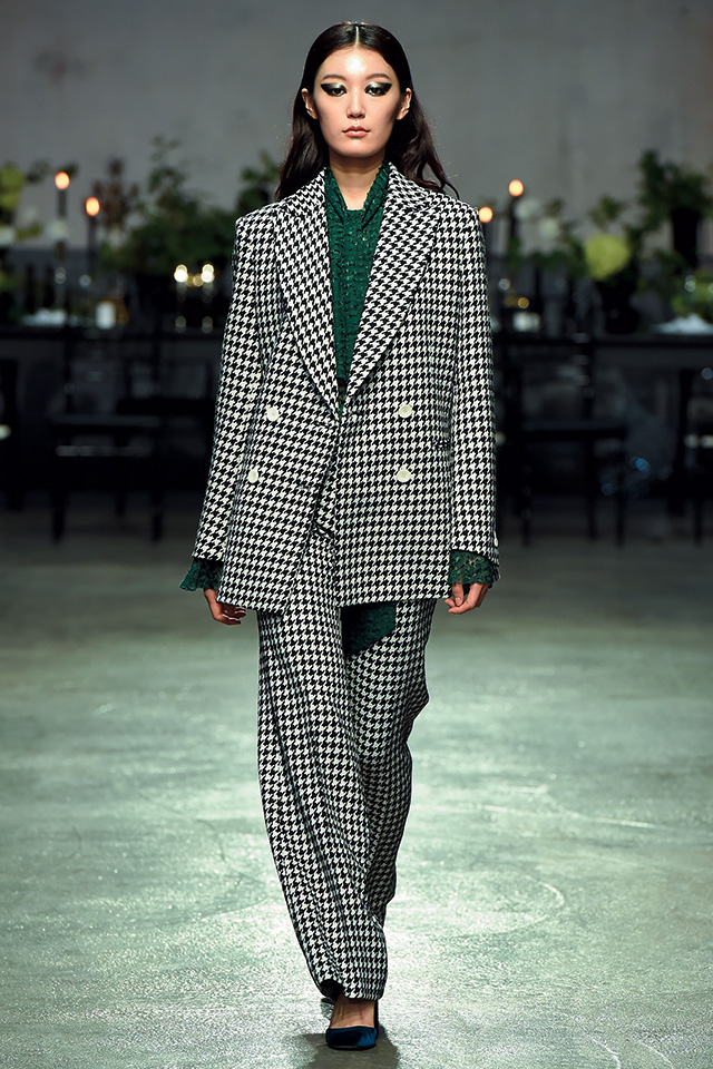 수많은 예술작품에 둘러싸여 시대를 풍미했던 전설적인 컬렉터 페기 구겐하임의 베네치아 자택으로 초대한 앤디앤뎁. 쇼장에 들어서자마자 런웨이 중앙에 놓인 식물들과 디너 테이블이 눈길을 끌었는데 제인마치 메종의 정재옥이 페기 구겐하임의 가드닝에서 영감을 받아 디자인했다고. 이번 컬렉션은 회화작품을 연상시키는 프린트와 컬러로 가득했다. 페기가 즐겨 사용하던 선글라스 프레임 장식과 벨 팬츠, 자카드 재킷, 티어드 드레스 끝자락 사이사이 은밀하게 보이는 레이스 소재와 벨벳 메리제인 슈즈가 우아하게 어우러졌고 모델들이 착용한 구조적인 헤드 피스와 아이 메이크업이 드라마틱한 무드를 완성했다.