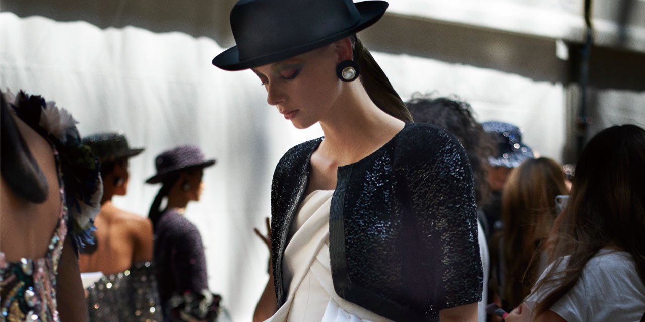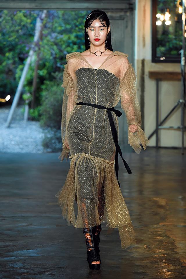 ‘The Orchestra’라는 테마 아래 다양한 관현악기로 구성된 오케스트라처럼 다채로운 스타일의 어울림을 컬렉션에 담아낸 지춘희. 시작은 에드워디언풍의 블랙 벨벳 롱 코트 룩. 그 뒤를 이어 레이디라이크 룩에 달콤한 컬러 팔레트가 더해진 룩이 등장했고 <화양연화>를 연상케 한 금붕어 프린트의 새틴 드레스, 섬세한 블랙 레이스 드레스, 과감한 컷아웃 디테일의 드레스, 전매특허인 누드 컬러의 드라마틱한 드레스들이 숨가쁘게 이어졌다. 지춘희의 타임리스 클래식은 트렌드와 관계없이 여성들의 로망을 자극한다.