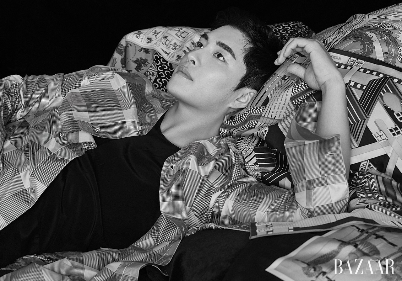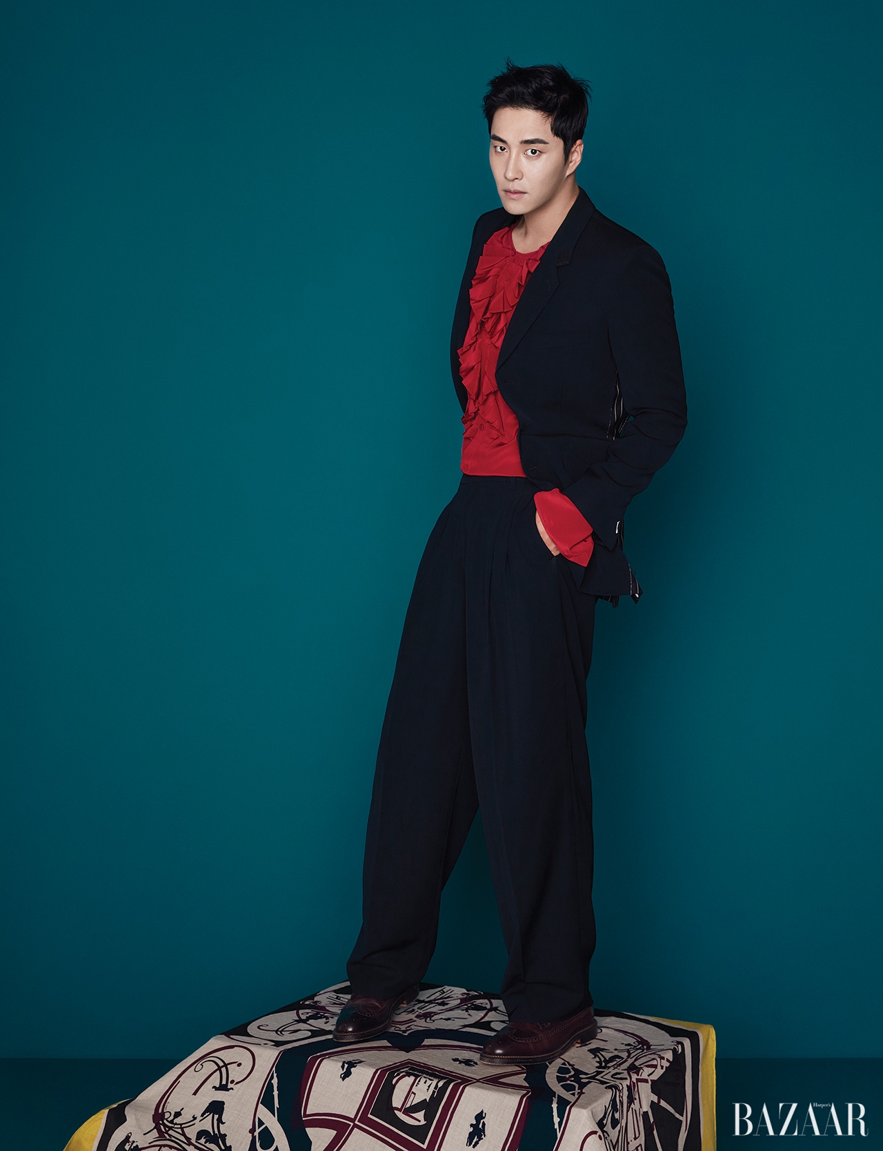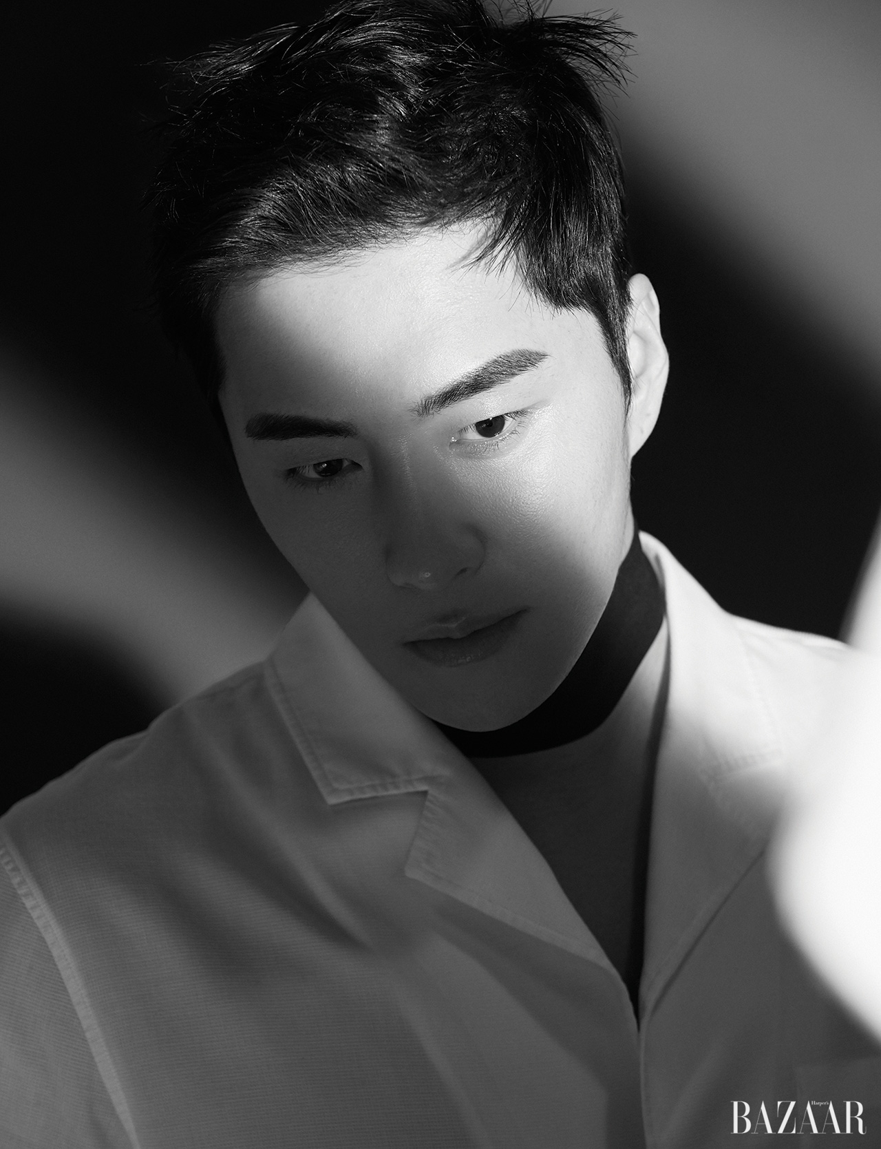 무대 위에 서는 배우들을 보면 가끔 ‘인간’처럼 보이지 않을 때가 있다. 관객의 귀와 심장 양 갈래로 직진하는 폭발적인 목소리, 안면근육이 터질 것 같은 드라마틱한 표정, 숨이 멎어버릴 듯한 과격한 몸짓. 이 모든 것을 동시에 하는 뮤지컬 배우는 그야말로 극한 직업 최전선에 있는 사람들이 아닐까 싶다. 폐활량, 체력, 근력, 목청, 어떤 기운마저도. 그들은 마치 다른 행성에서 떨어진 사람들 같다. 민우혁 역시 그랬다. 일단은 190cm에 얼마 모자라지 않는 장신에 주춤했다. 촬영을 위해 높이감 있는 오브제에 우뚝 솟으니 루브르나 대영박물관에서 크로키 할 법한 고대 조각상 같은 장엄한 포스를 뿜었다. 그가 본격 촬영에 임하자 순간 그 공기가 무대처럼 변했다. 고고하게 섰다가 앉았다가 다시 드러눕기도 했다. 물론 그는 중간중간 멋쩍어했다. 그러나 셔터가 ‘팡’ 하고 터질 때마다 빛도 튕겨 나갈 법한 강렬한 레이저를 눈동자에서 발사했다. 사진가도 흠칫 놀랐다.