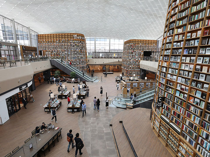 지난 5월 31일, 강남 상권의 랜드마크인 스타필드 코엑스몰에 ‘별마당 도서관’이 오픈했다. 2,800㎡ 면적에 두 개의 층으로 구성된 엄청난 공간! 천장까지 이어진 13m 높이의 대형 서가는 ‘읽는 재미’ 뿐만 아니라 ‘보는 재미’까지 선사한다. 높은 책장 3개를 중심으로 배치된 테이블과 책상은 혼자 책을 읽기에도, 휴식을 즐기는 공간으로도 제법 어울린다. 전 장르에 걸친 책만 5만여 권, 거기에 아이패드를 이용한 최신 E-book 시스템까지 갖춰져 있다. 또한, 그룹형 커뮤니티 공간이 마련돼 있어 독서 모임을 하기에도 제격! 물론 누구나 무료로 이용할 수 있다.