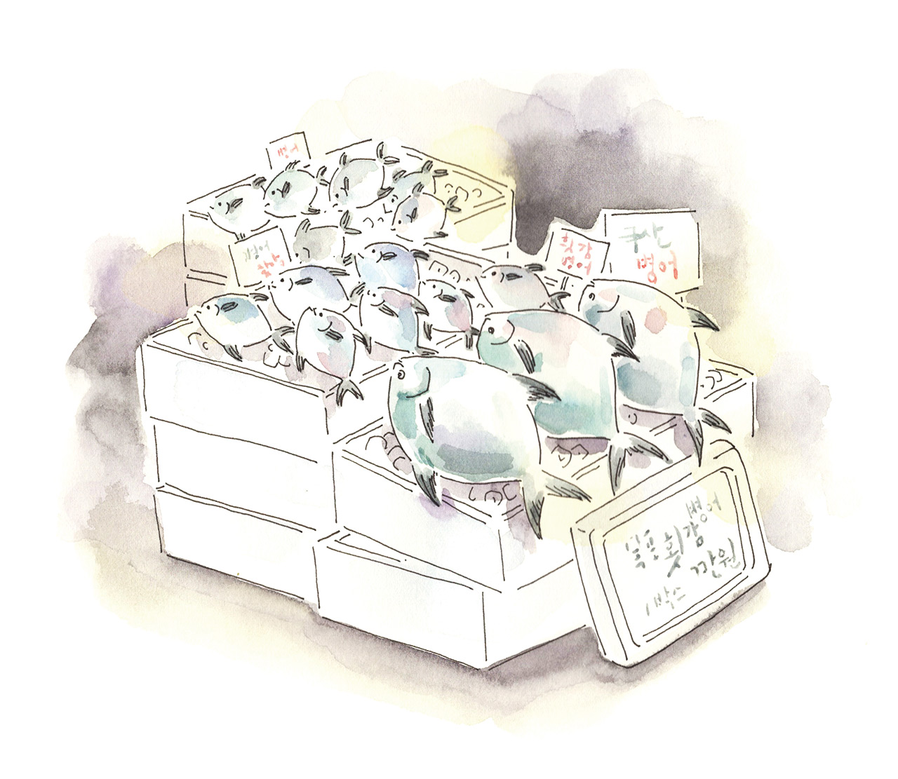 다른 빛은 병어다. 갈치만큼은 아니지만, 병어도 수산시장의 촉수 높은 전등 빛을 받아 반짝반짝한다. 두 어종의 얼굴은 아주 대조적이다. 갈치는 언제든지 살아서 사람을 물어뜯을 것처럼 험상궂지만, 병어는 유순한 강아지처럼 고분고분하게 보인다. 병어의 눈망울을 보면 도저히 회칼을 들이밀기 어렵다. 다행스러운 건 병어가 산 채로 유통되는 경우는 아주 드물다는 점이다. 병어는 잡혀서 얼음이 가득 든 나무 상자에 고단한 몸을 누이고 있다. 작고 반짝이는 병어는 마치 별을 따다가 진열한 것처럼 보인다. 상인들은 작은 병어에는 ‘세꼬시감’이라고 써서 붙여놓거나, 입으로 호객을 한다. “이봐, 세꼬시 할 거면 다른 데 갈 필요 없어. 막 경매 뗀 거야. 물에 다시 던지면 헤엄친다고.”