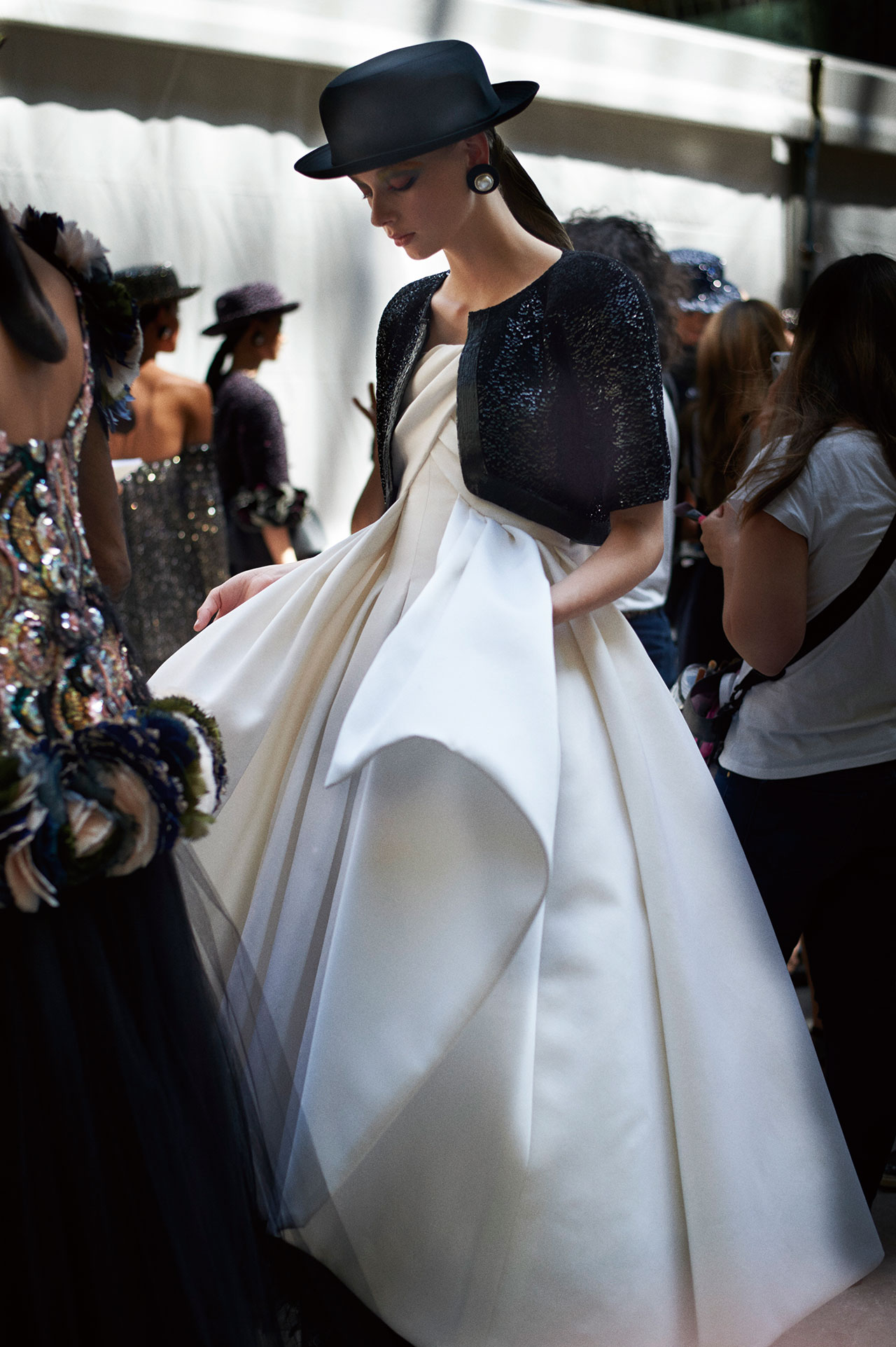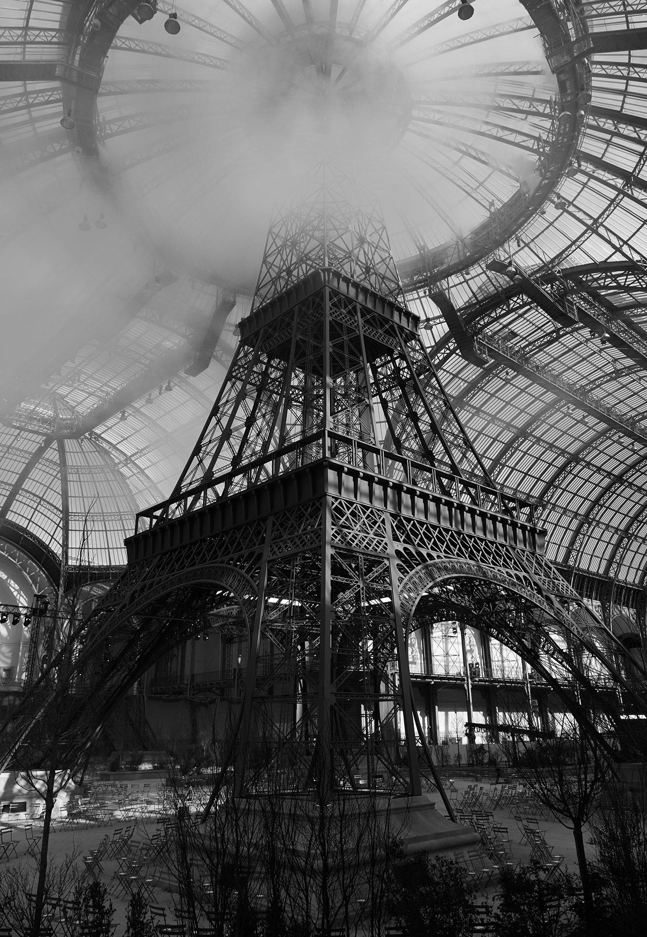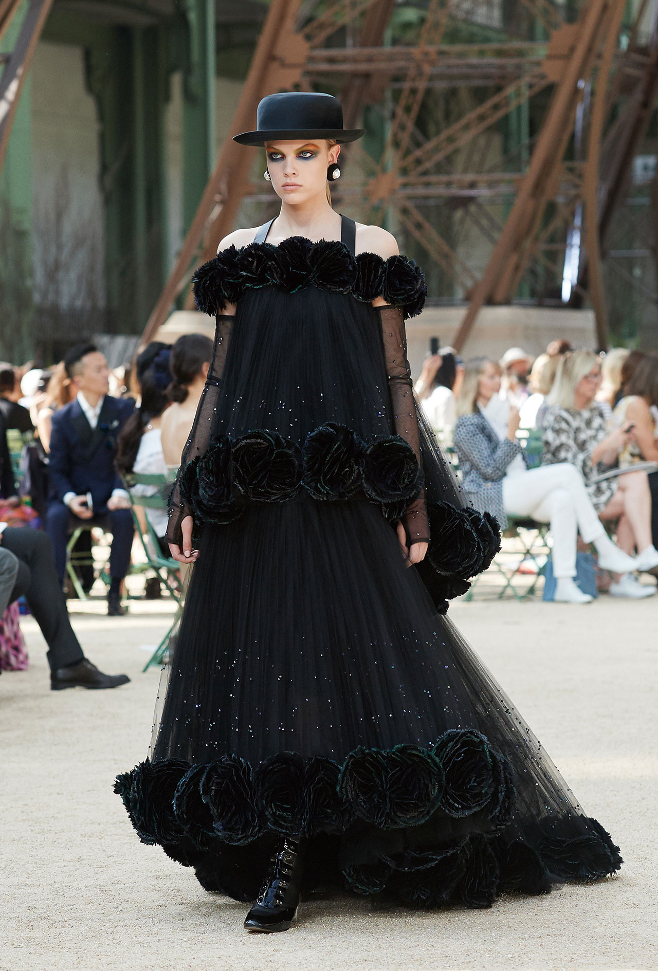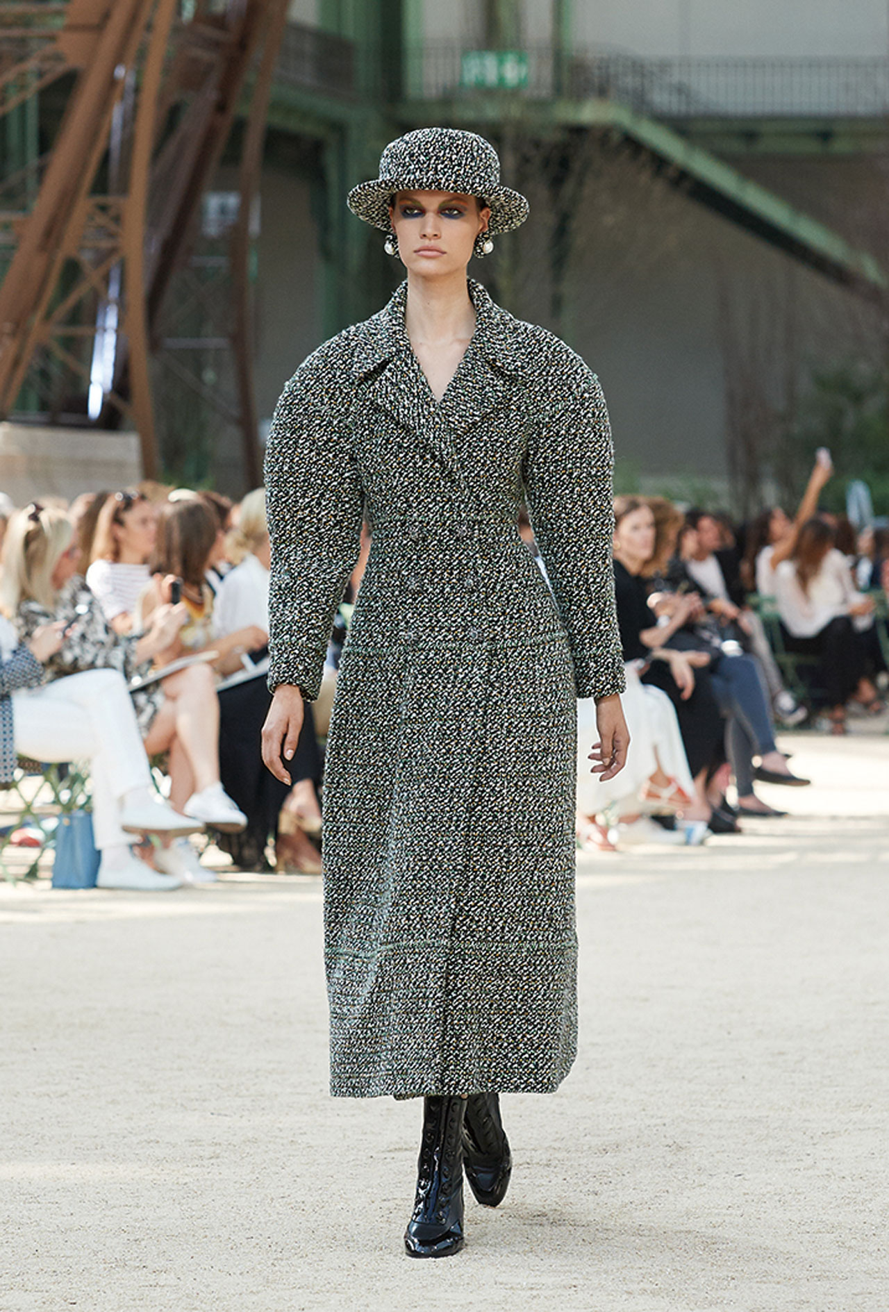 쇼가 끝난 직후, 칼 라거펠트는 파리 시장 안느 이달고로부터 파리 최고 권위 훈장인 ‘그랑 베르메이(Grand Vermeil)’ 메달을 수여 받았다. 이는 전 세계에 프랑스 패션의 아름다움을 전파해온 쿠튀리에를 향한 존경과 감사의 의미를 담은 것이었다. 이번 컬렉션 또한 파리, 파리지엔을 향한 애정이 담긴 피스들로 채워졌고 이를 뒷받침하듯 그랑팔레의 중심에 파리를 대표하는 건축물이자 컬렉션의 영감이 된 에펠탑이 우뚝 솟아있었다. “파리의 여성이 되살아난 모습과도 같아요. 컷과 형태, 실루엣으로 모든 것을 말하고 있죠.” 보울러 햇에 진주 장식의 앤티크한 귀고리, 끝까지 단추를 잠근 싸이하이 부츠와 부티를 신은 모델들이 에펠탑 아래로 걸어 나왔고, 건축적이고 그래픽적인 실루엣의 의상들은 클래식함을 바탕으로 하고 있었으나 모던하게 느껴졌다. 하우스를 대표하는 트위드 재킷은 롱 튜닉 형태나 크롭트, 더블 브레스티드 재킷으로 등장했으며, 랩 어라운드 스커트, 튜블라 드레스, 점프수트에 함께 매치됐다. 그가 “퍼(Fur) 처럼 표현했다.”고 전한 깃털 장식은 수트와 드레스 곳곳을 넘나들며 제 역할을 톡톡히 해낸 모습. 쇼 후반부에 등장한 새틴 소재, 블랙 실크 튤, 시폰 소재의 드레스들은 반짝이는 소재와 기하학적인 실루엣(마치 밤에 바라본 에펠탑의 모습처럼)의 이브닝 드레스들은 샤넬 쿠튀르의 정수를 고스란히 보여주는 듯 했다.