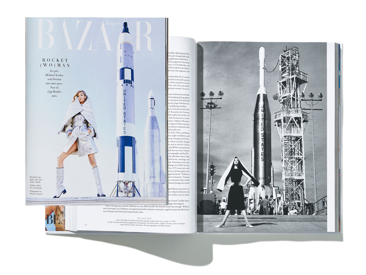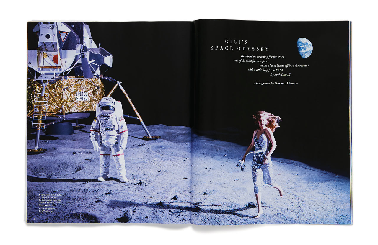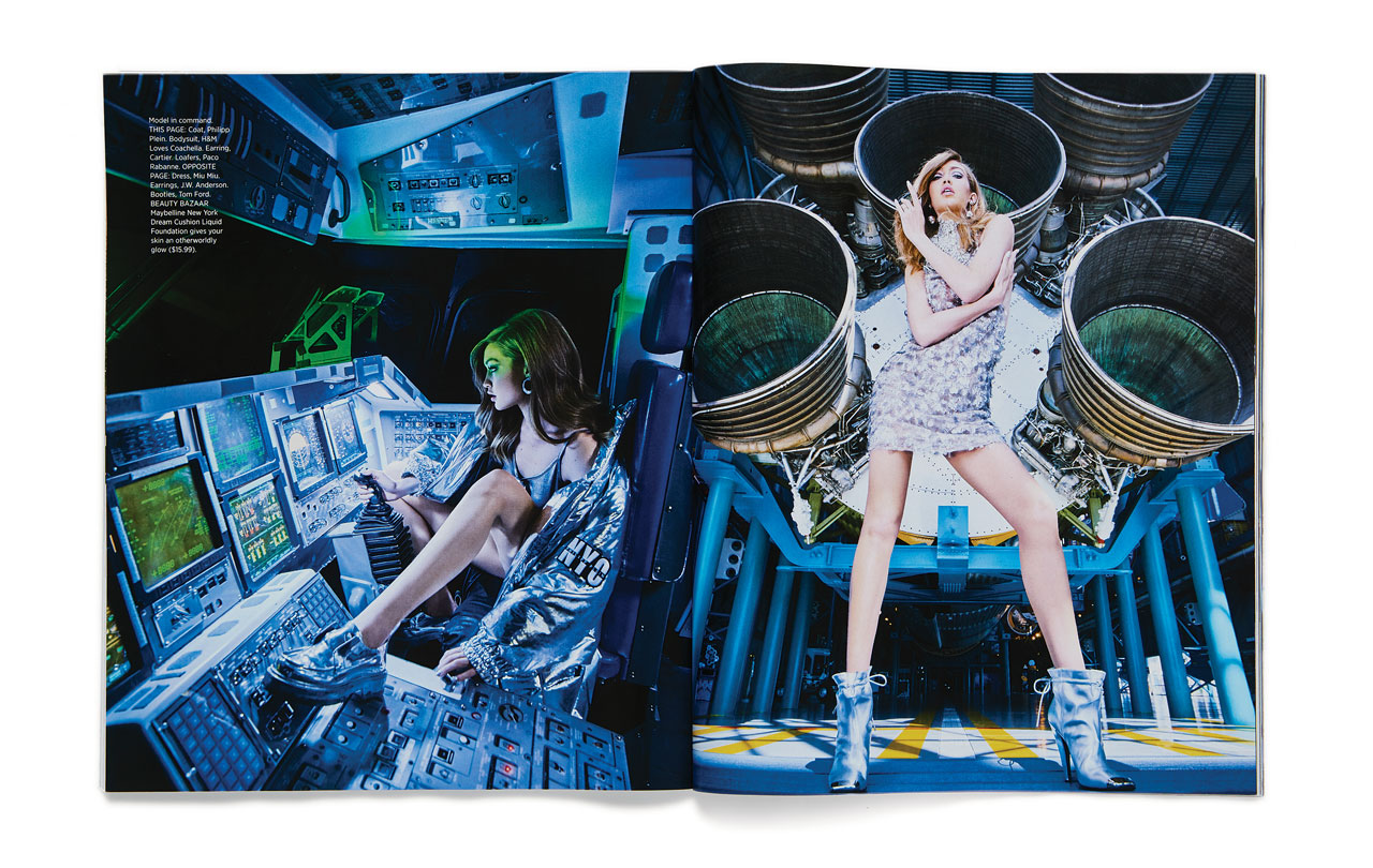 이번에도 <바자>는 진 슈림턴에 이어 지지 하디드를 플로리다 주에 위치한 나사의 케네디 스페이스 센터로 초대했다. 지지 하디드는 진 슈림턴이 섰던 그 자리에서 시작해 샤넬의 패딩 케이프 코트를 두르거나, 돌체 앤 가바나의 비즈 드레스, 프로엔자 스쿨러의 실버 가죽 점퍼, 구찌의 크리스털 점프수트를 입은 채 나사 기지 곳곳을 활보했다. 그렇게 새로울 것 없는 요즘 세상에서 누구든 단 한 번도 경험하지 못한 곳, 우주라는 곳을 향한 환상은 부푼 기대감과 함께 다시금 패션계를 매료시키고 있다. 물론 샤넬의 실버 부츠를 신고 새로운 행성을 밟는 그날은 엘튼 존의 ‘로켓맨’ 가사 ‘And I Think It’s Gonna Be a Long Long Time’처럼 꽤 오랜 시간이 걸릴 테지만 말이다.