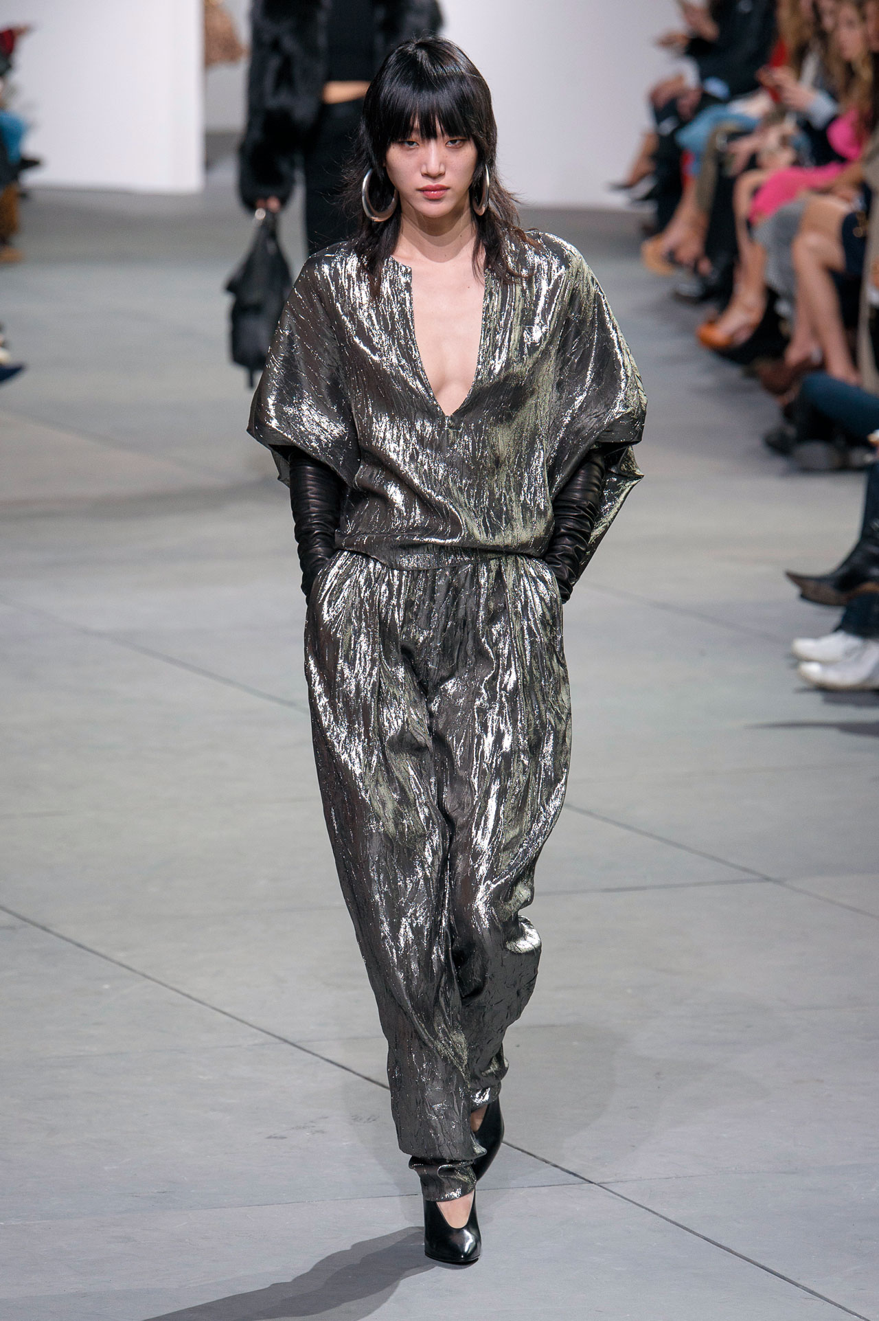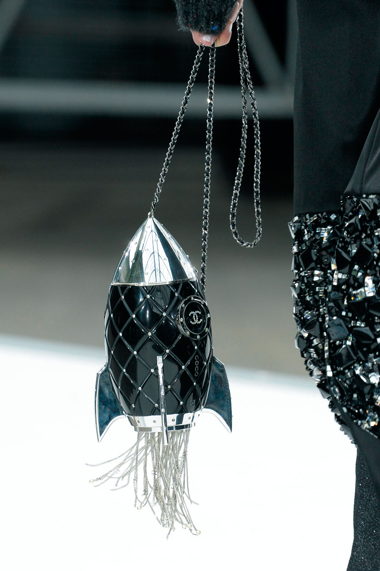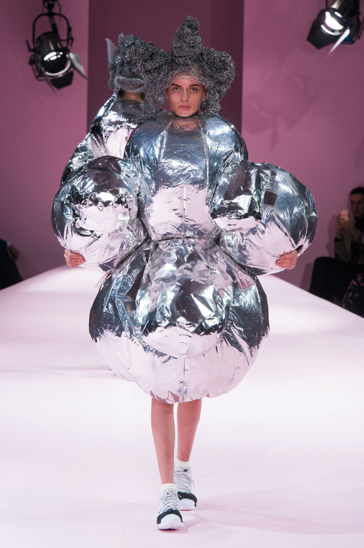 그로부터 한 달 후인 지난 3월, 급기야 칼 라거펠트는 그랑 팔레에 샤넬의 우주선 기지를 우뚝 세웠다. “우주정거장으로 가세요. 그건 우리가 원하는 미래이자 환상의 세계죠.” 언젠가 다른 행성에서 열릴 크루즈 컬렉션을 상상한 듯. 헬멧을 벗었을 때 우주복의 형태를 닮은 하이 라운드 네크라인에 메탈릭 터치를 더하고, 절연 수트나 메탈릭 패딩, 문부츠를 매치하며 우주선의 승무원부터 우주여행을 떠나는 여행객을 위한 패션까지 제안했다. ‘실루엣의 미래’라고 간단하게 컨셉트를 정의한 레이 가와쿠보는 친환경, 신소재를 연상시키는 매우 미래지향적인 콤 데 가르송 컬렉션을 선보였다. 특히 컬렉션 중간에 등장한 절연 소재의 실버 룩, 그리고 이어서 등장한 오버사이즈 코트들은 마치 하나의 행성이나 우주선 그 자체와도 같았고 이는 새로운 퓨처리즘 룩의 등장처럼 느껴졌다. 이외에도 밤하늘과 우주의 행성들을 드레스 위에 수놓은 디올, 은하수 혹은 섹시한 우주복을 연상시키는 스파클링 룩을 선보인 생 로랑을 비롯해 본딩이나 패딩을 통해 몸집을 부풀리거나, 단단한 질감을 통해 외부 환경으로부터 보호를 받을 수 있을 것만 같은 미래지향적인 룩들이 가득했다. 지난 시즌 메탈릭 룩이 1980년대의 관능적인 디스코 스타일을 연상케 했다면, 이번 시즌엔 보다 기능적이고 방어적인 측면이 강조되어 1960년대의 퓨처리즘을 새로운 버전으로 부활시킨 것이다.