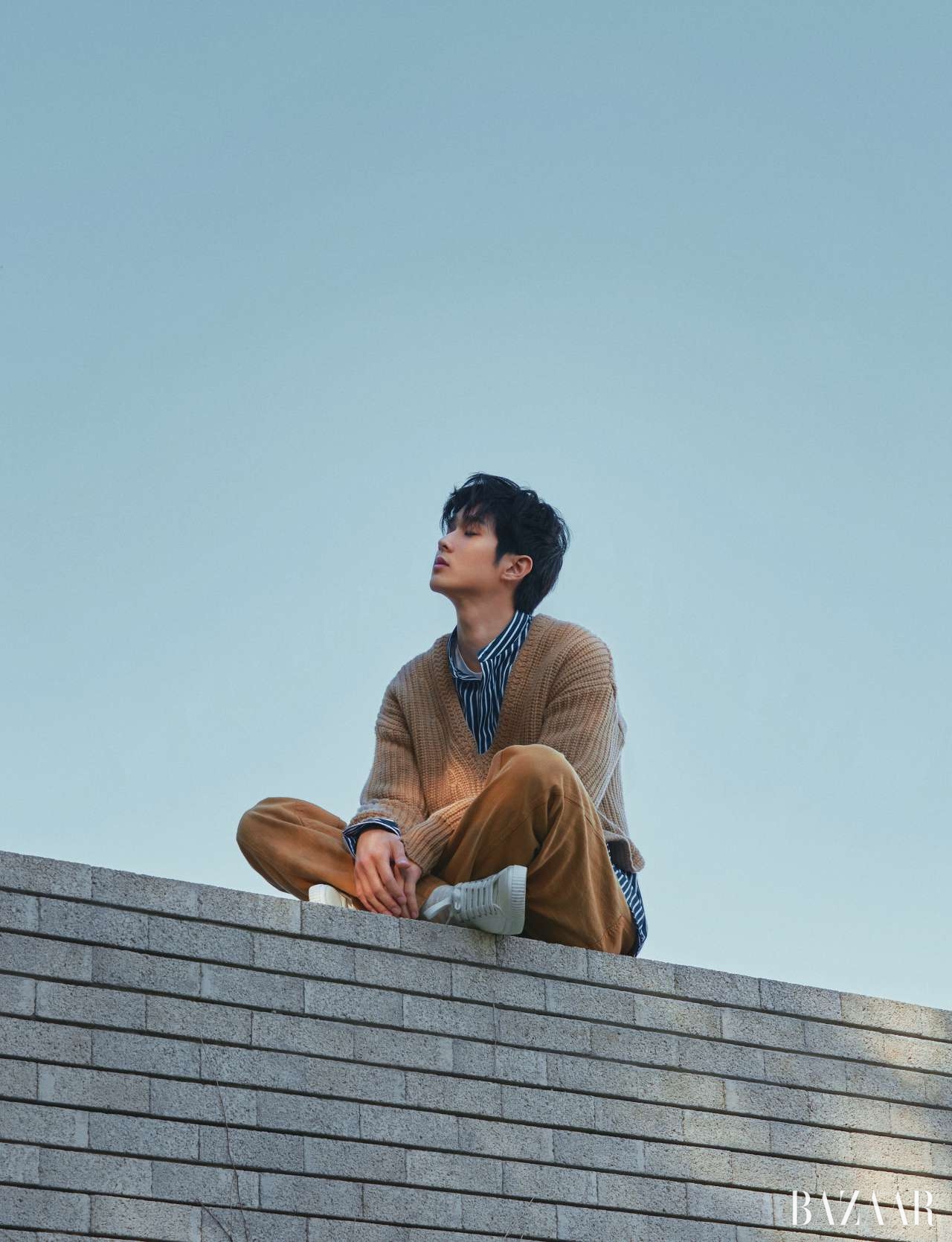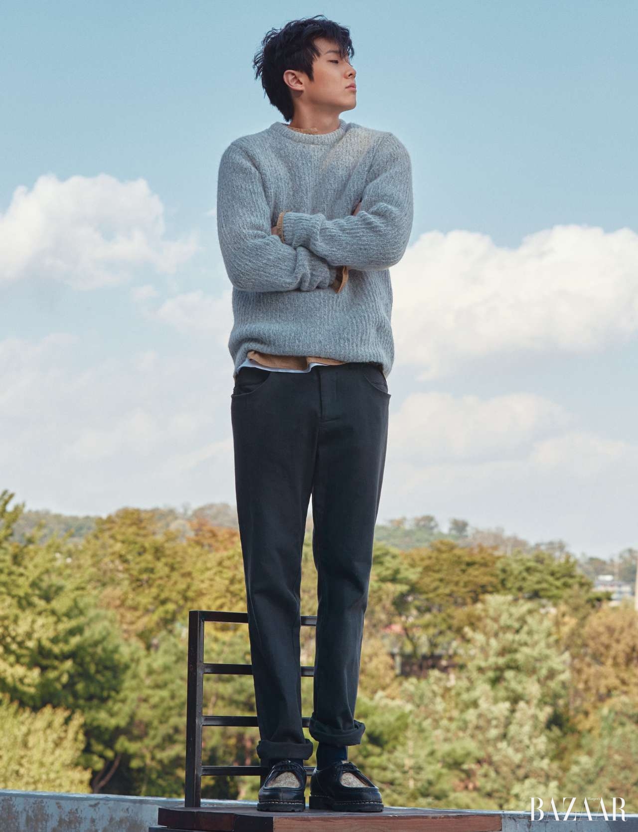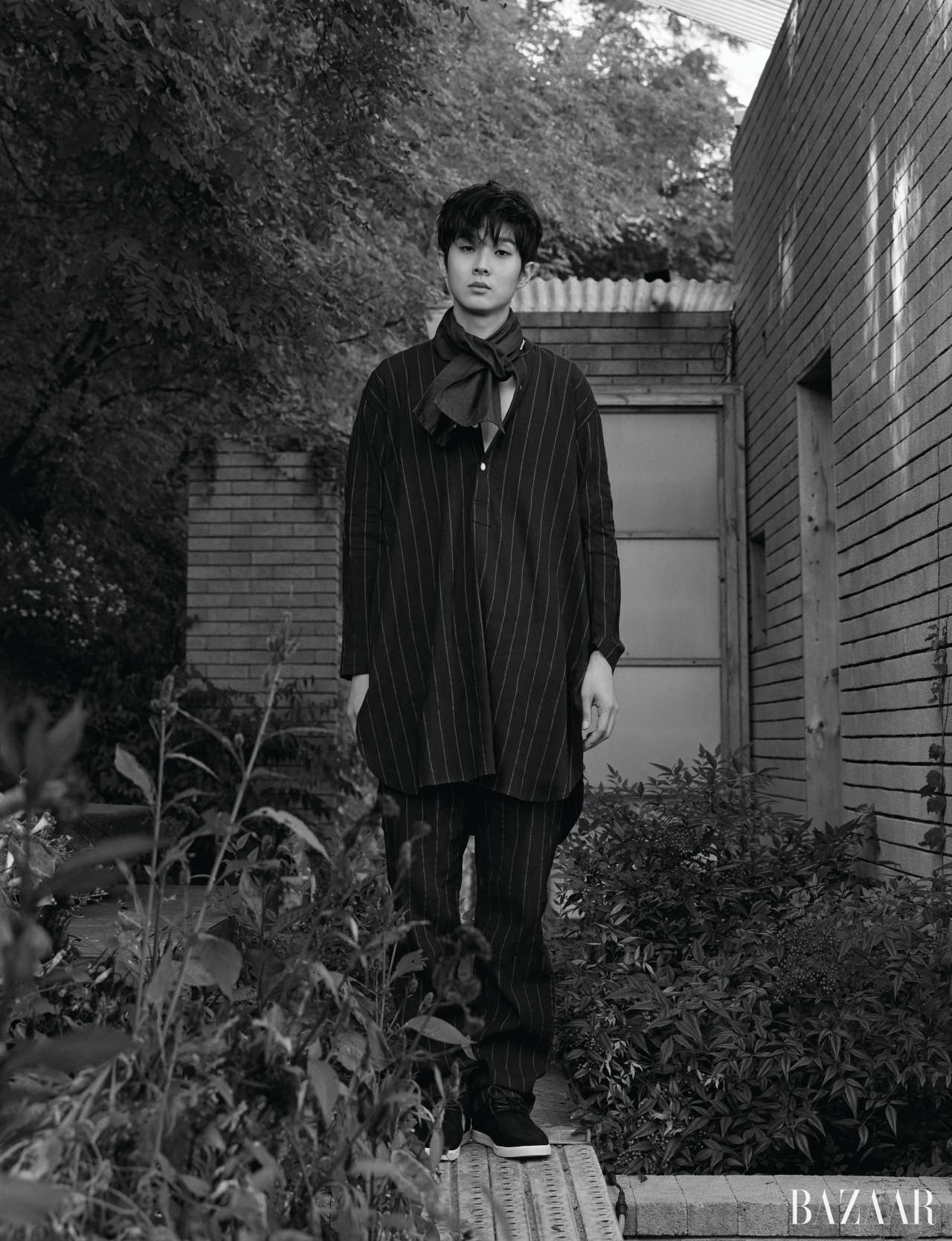 혜화동 산꼭대기에 있는 작은 벽돌집. 침을 ‘꼴깍’ 삼켜야 할 만큼 경사가 가파른 그곳으로 최우식을 초대했다. 눈부신 햇빛을 손으로 가리며 그가 검은 차에서 내렸다. 사방이 막혀 있는 큐브 형태의 스튜디오는 왠지 최우식과 어울리지 않는다고 생각했다. 휘청거리는 낡은 사다리를 타고 올라가면 등장하는 탁 트인 하늘, 제멋대로 자라난 정체 불명의 숲, 불쑥불쑥 출현하는 산 고양이들. 최우식은 호기심으로 여기저기 탐색하고 궁금해했다. “와, 여기서 술 마시면 아침까지 마실 수 있을 것 같은데요?” 촬영 내내 재미있는 현상을 하나 포착했는데, (나를 포함한) 스태프들이 다들 양 볼에 달걀을 머금은 듯 그를 보고 ‘빙그레’ 웃고 있었다는 점이다.