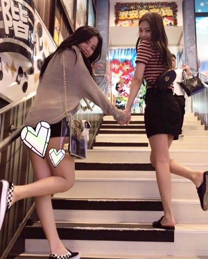 제니의 사복 패션. 줄무늬 티셔츠와 미니스커트로 발랄하게 연출하고, 구찌 로고 백으로 귀엽게 마무리했다.