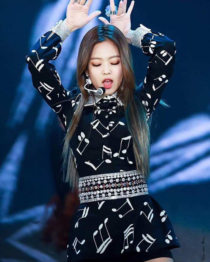 음표가 그려진 생로랑의 원피스와 큐빅이 장식된 벨트로 무대 의상을 완성했다. 블랙핑크는 과감한 디자인의 액세서리를 잘 조합하는 것으로 유명하다.